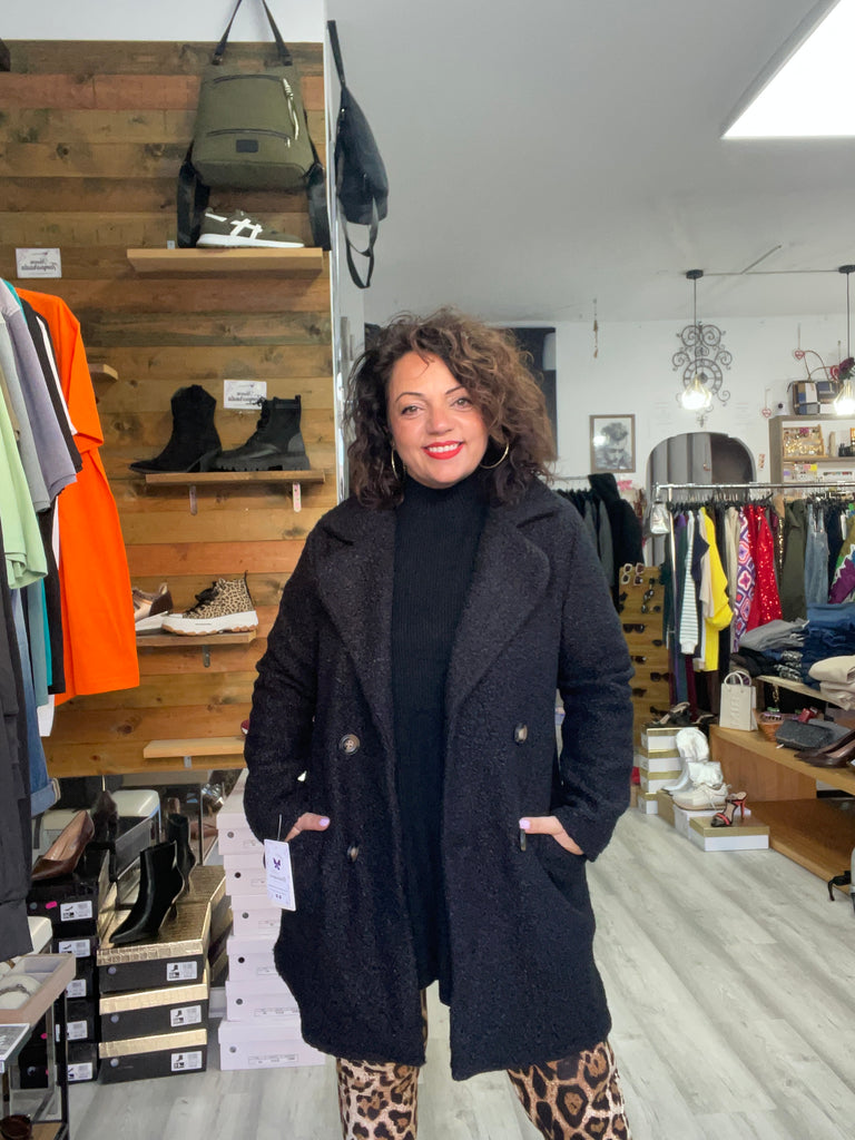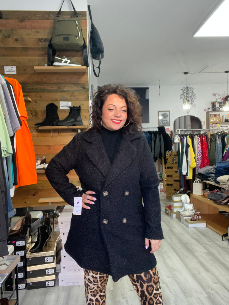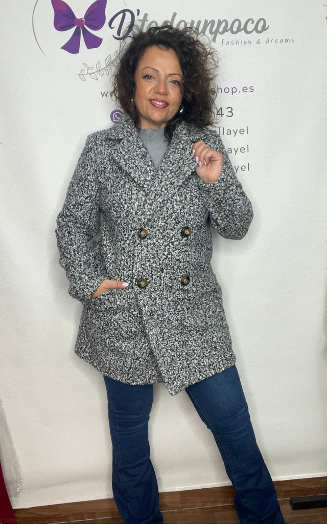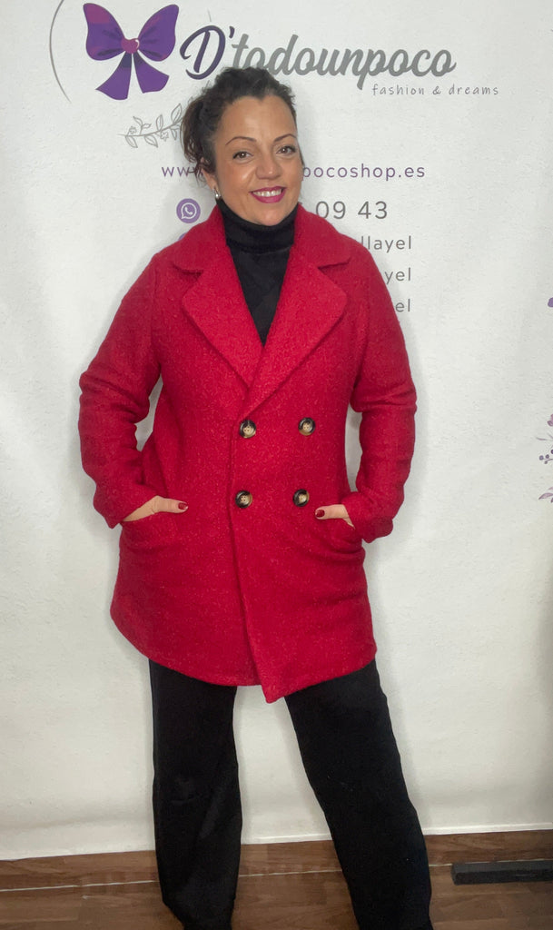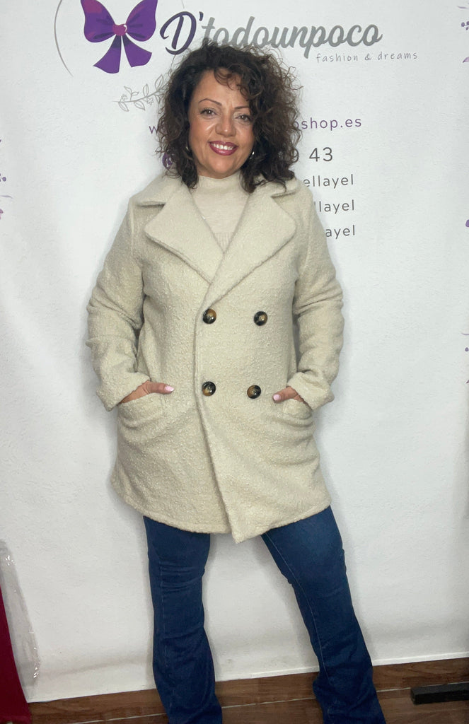 Abrigo talla unica, talla36-38 a la 42-44. No lleva forro , cello esmoquin, bolsillos forrados en los laterales, manga larga, largo por mitad de pierna y tejido borreguito y divino para cualquier día de la semana.