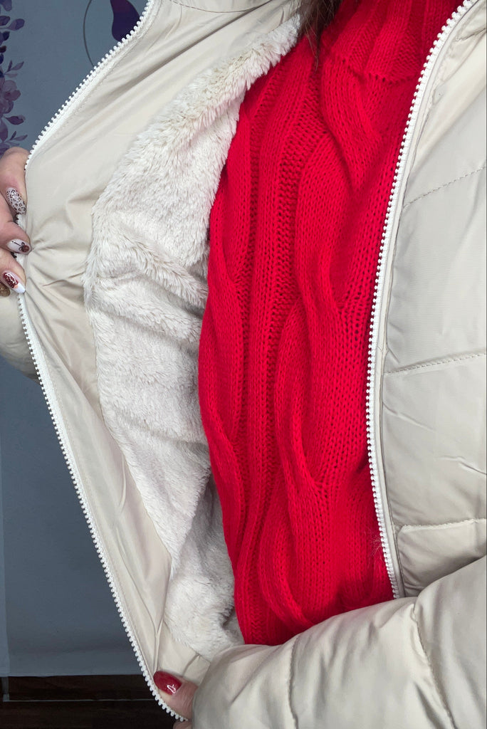 Abrigo por tallas en color beige, tallas desde la S a la XXL, yo llevo la M con jersey fino y la L con jersey gordo. Largo a la cadera bolsillos laterales con cremallera, capucha que se puede quitar y el pelito también. Interior de pelo para que no paséis frio.