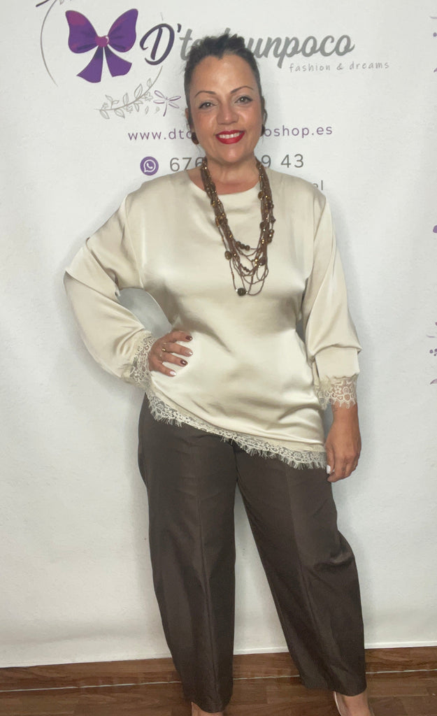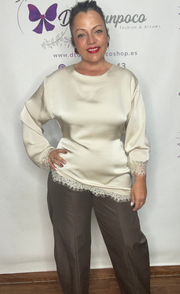 Blusa talla unica de la 34 a la 40/42, raso manga larga con encaje en las muñecas, asimétrica de bajo con encaje, cuello redondo con botón atrás y cordón para ajustar la cintura.