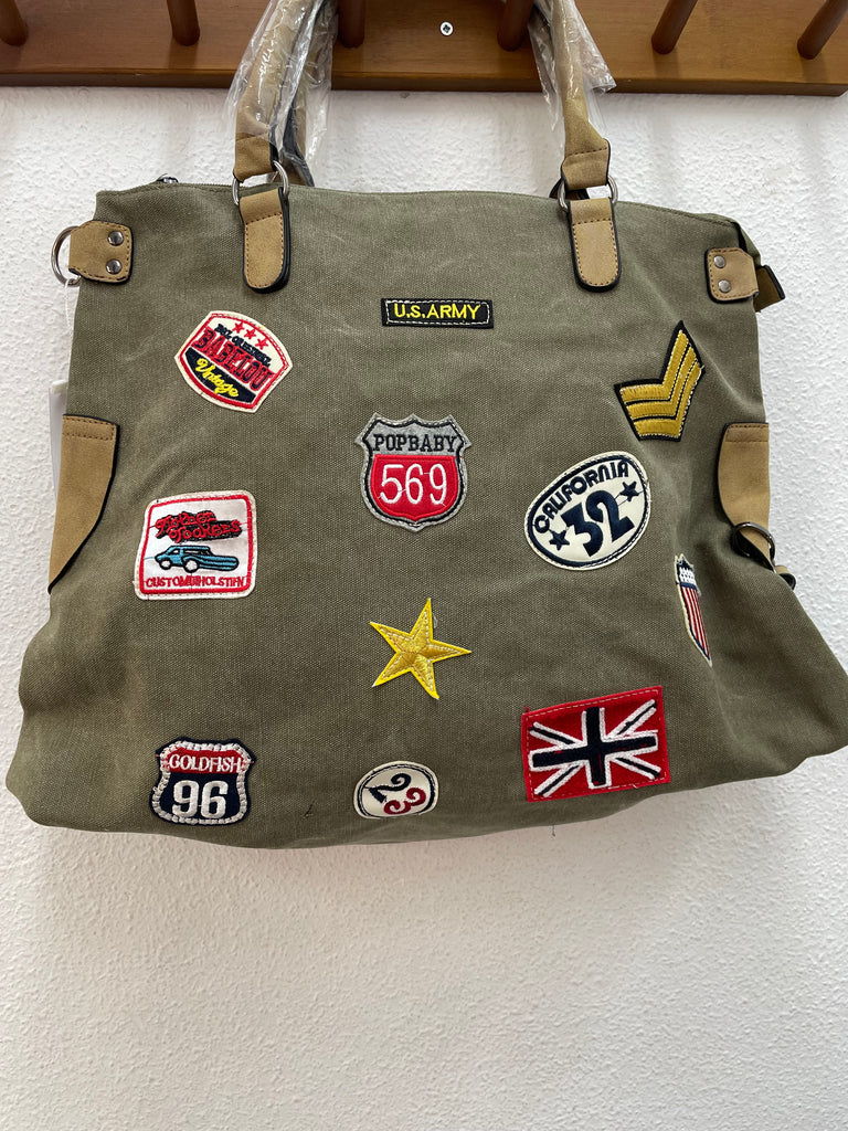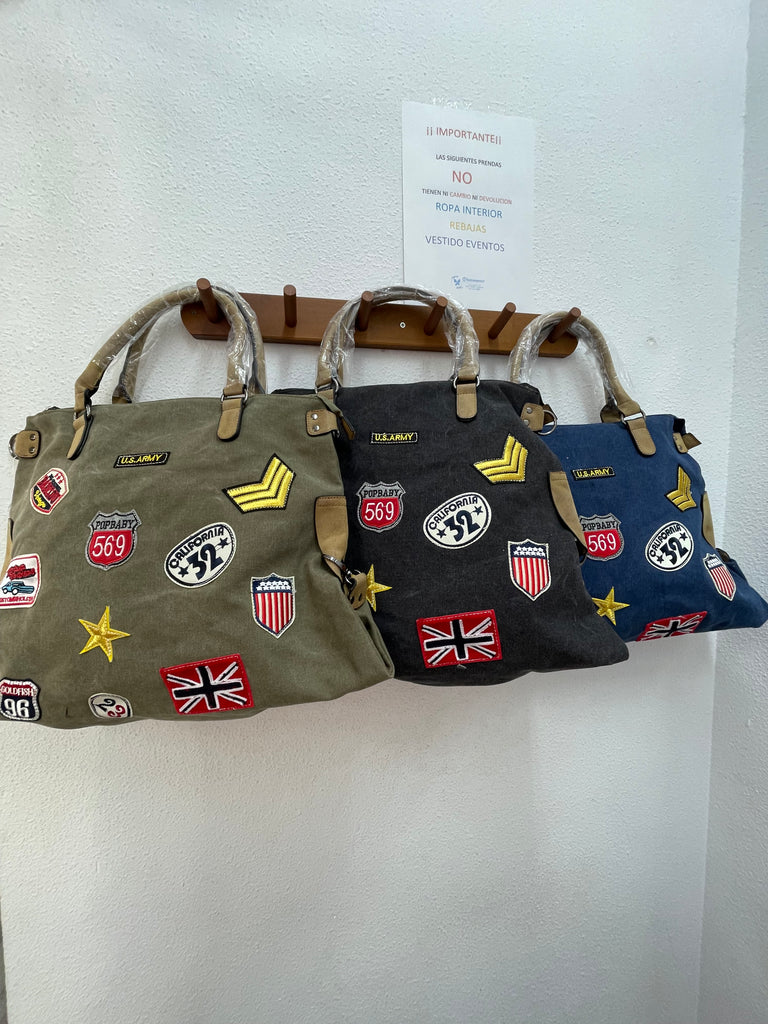 Bolso grande en tejido como vaquero, lleva asas y bandolera para cruzar, bolsillo detrás y cremallera, interior amplio y con enganches para darle mas capacidad.