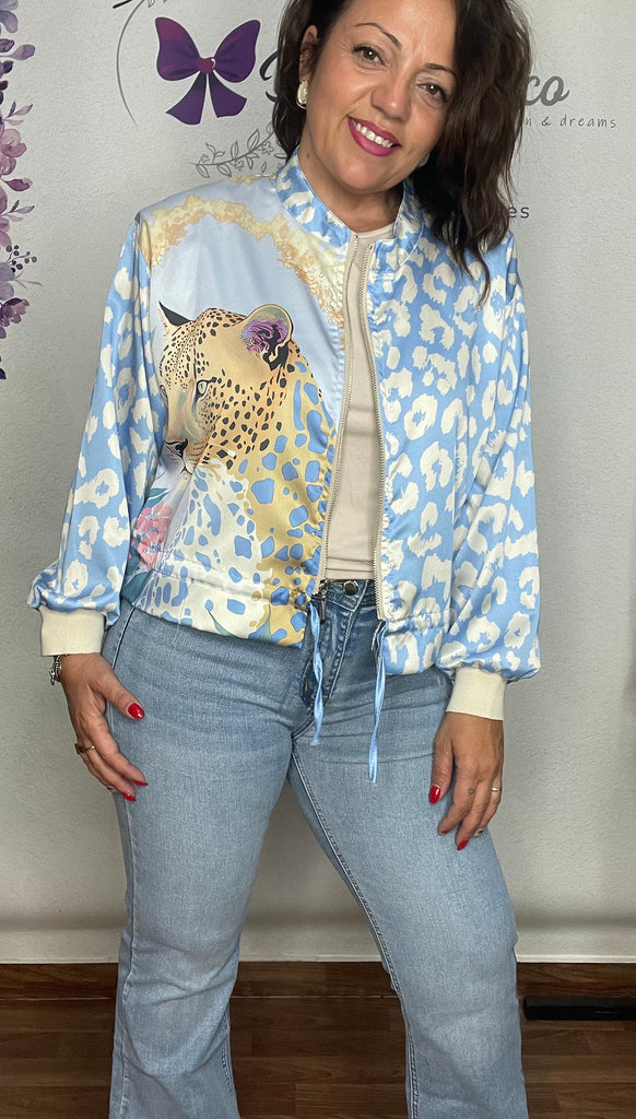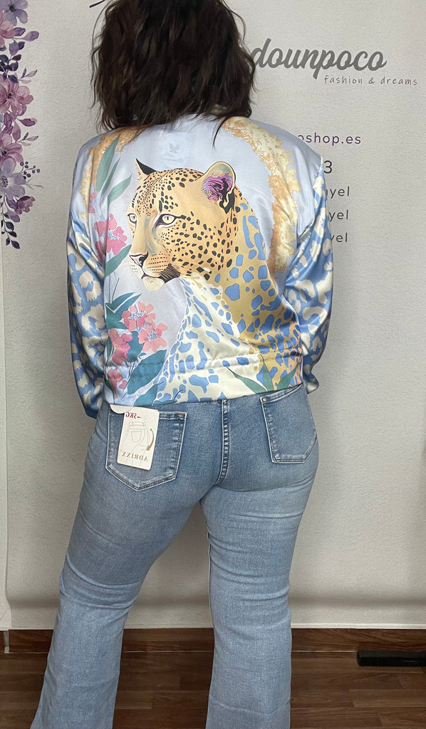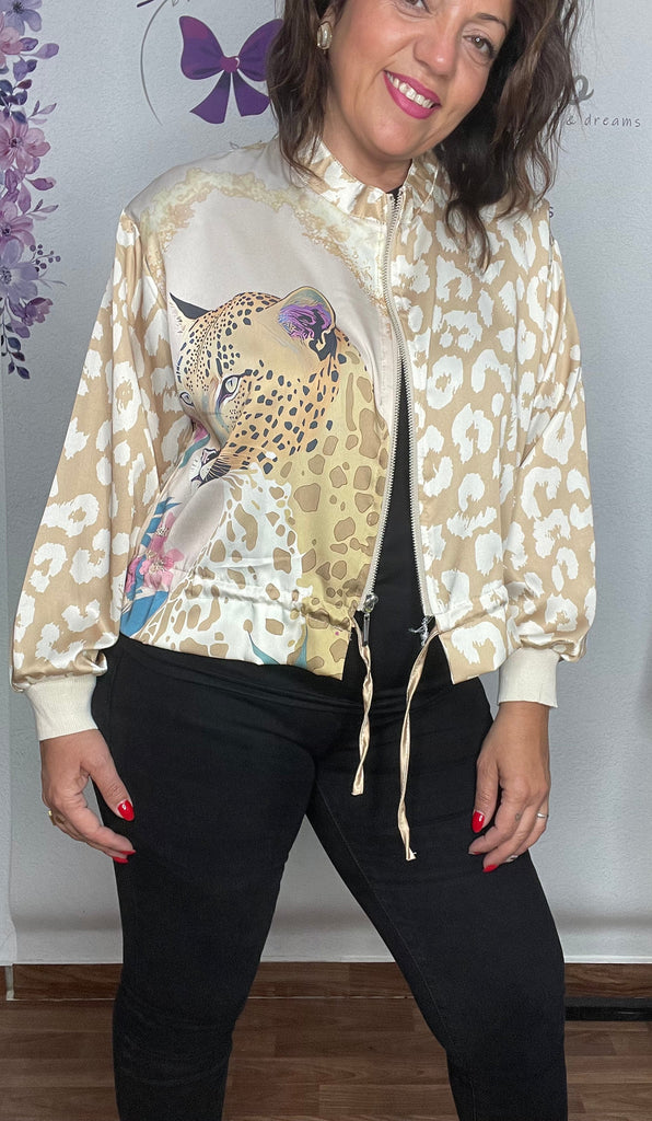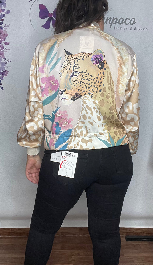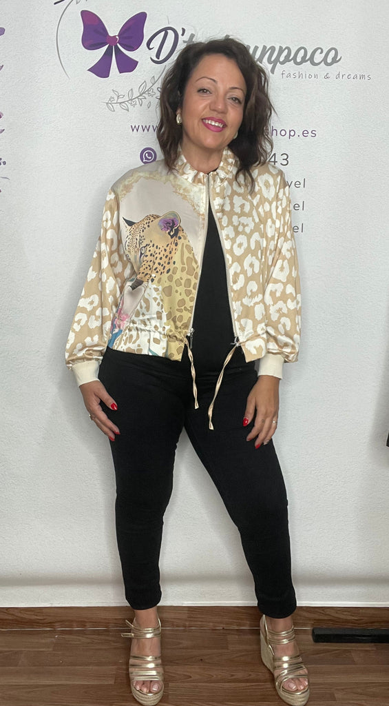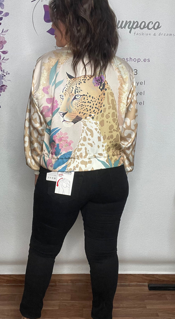Bomber talla unica de la 36 a la 42, raso manga larga con puño elástico, cremallera y cordón en la cintura para ajustarla.