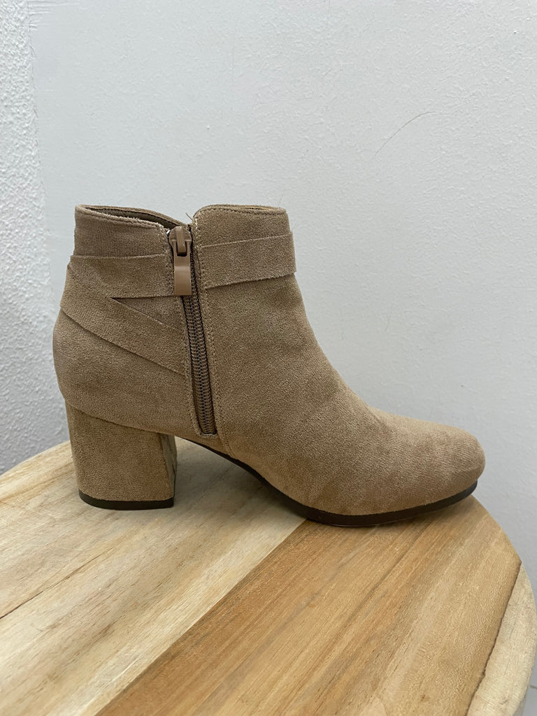 Botín muy cómodo, color BEIGE topo, detalle del lazo , interior de pelito