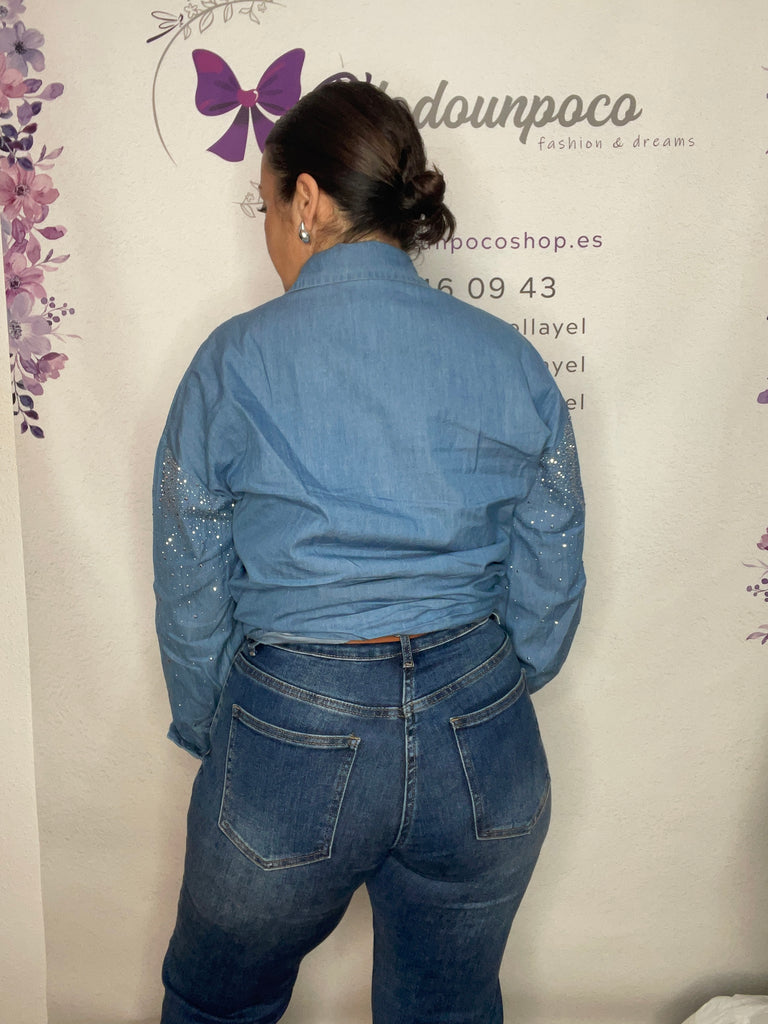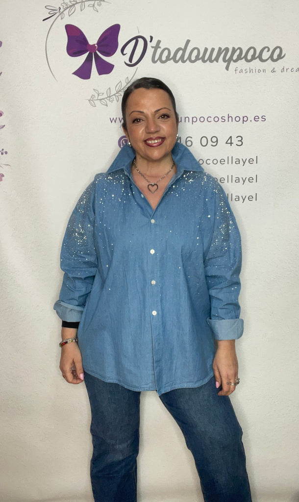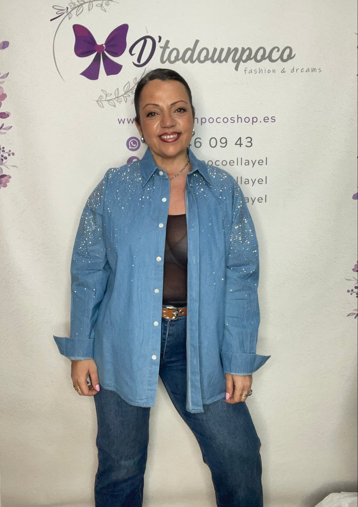 Camisa dos tallas S/M sisa 60cm y L/XL sisa 62cm, es oversize, manga larga con puño y botón, abotonada entera y la parte de delante con brillitos para realzar tus looks, por detrás lisa, es larga.