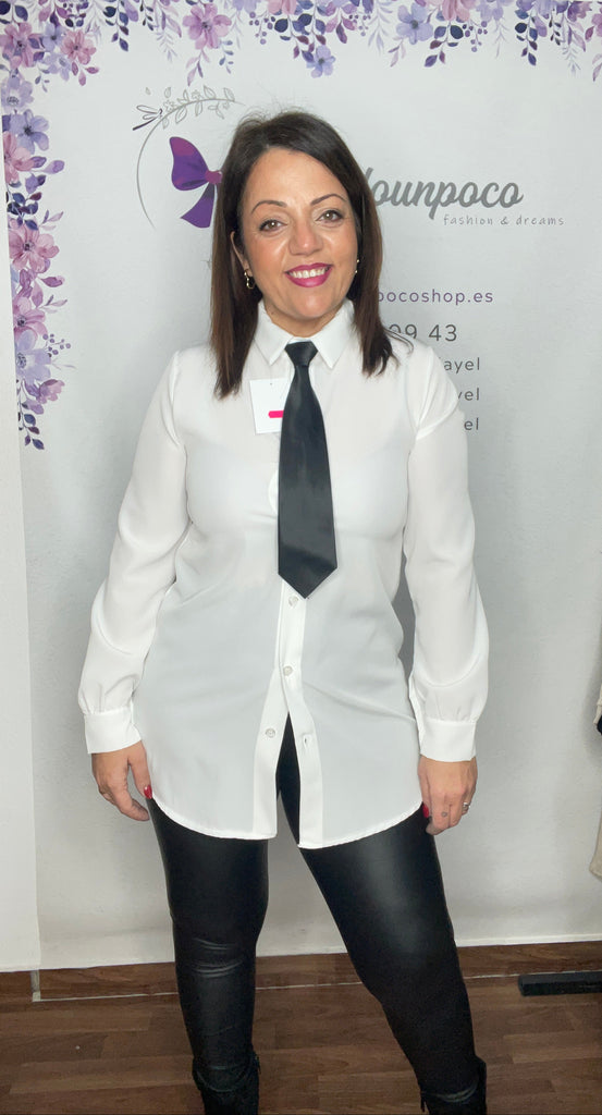 Camisa talla unica de la 34 a la 38, manga larga con puño, abrochada entera y larga. Lleva la corbata incluida y se ajusta con cremallera.