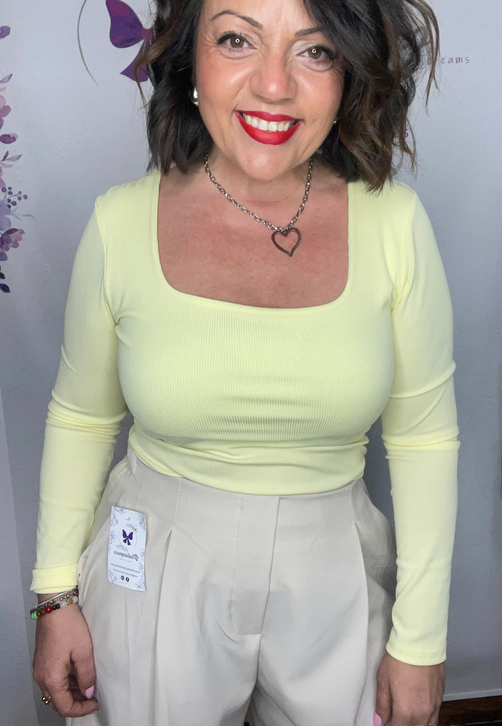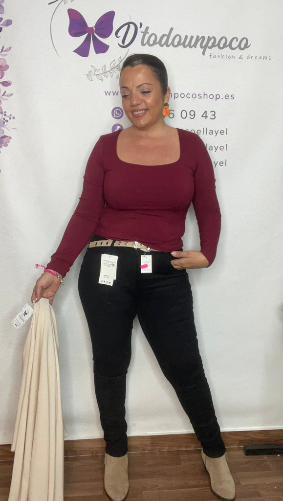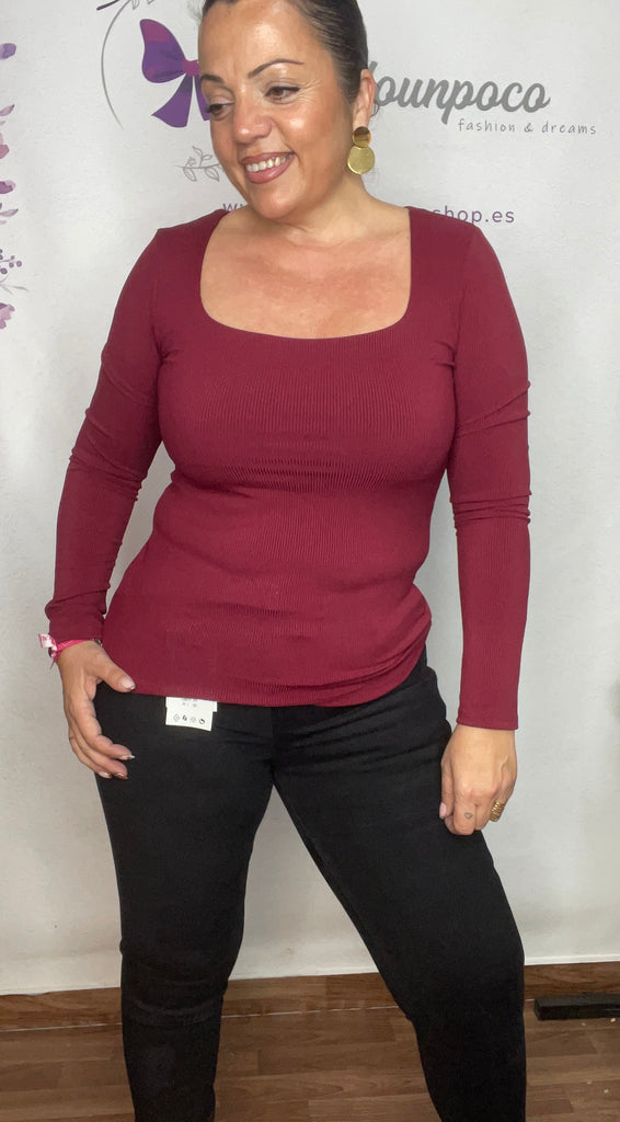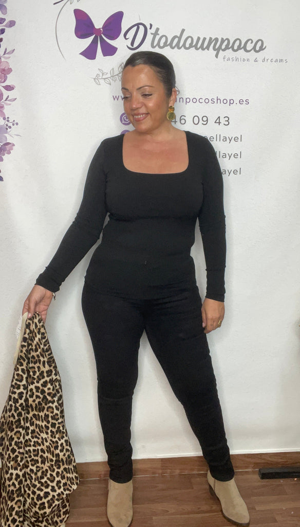 Camiseta talla unica de la 36 a la 42, manga larga escote cuadrado con forro en el pecho, larga por la cadera y tejido canale.