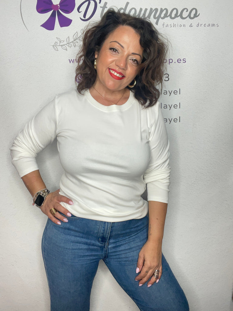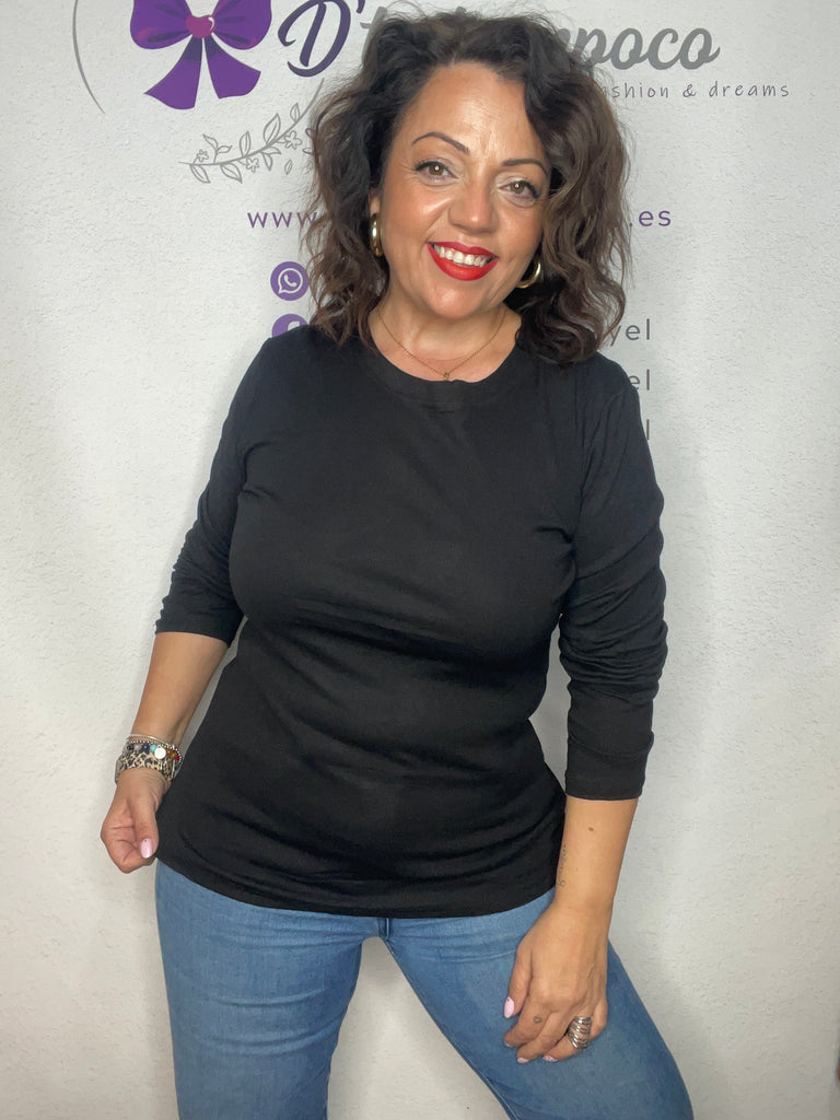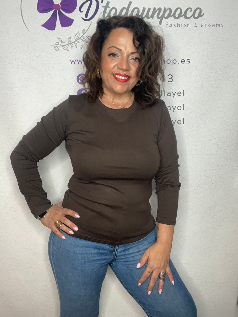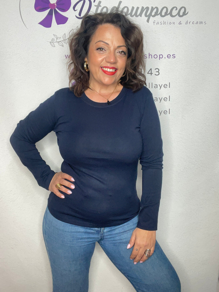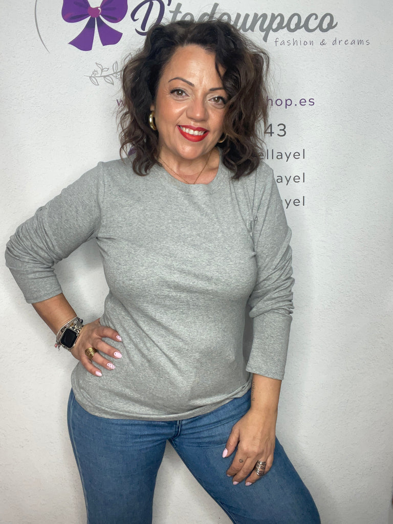 Camiseta por tallas desde la S a la XXL, yo llevo la L cómoda la M a justada, manga larga cuello redondo y larga a la cadera, tejido 95% algodón, 5% elastano. super agradable.