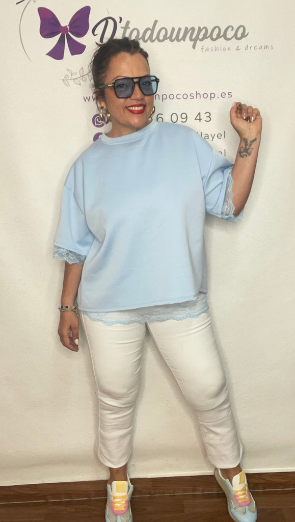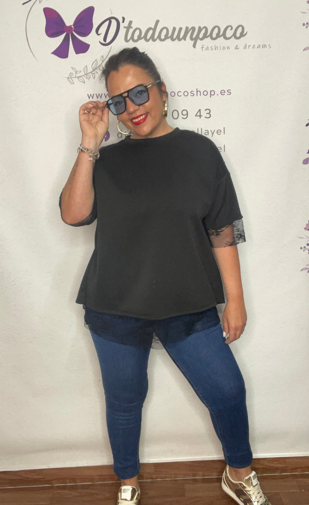 Camiseta talla unica de la 36 a la 42/44, manga corta oversize con encaje tejido capa de aire lleva una camiseta bajo de encaje que se ve por delante bajo y por detrás por que la camiseta es abierta