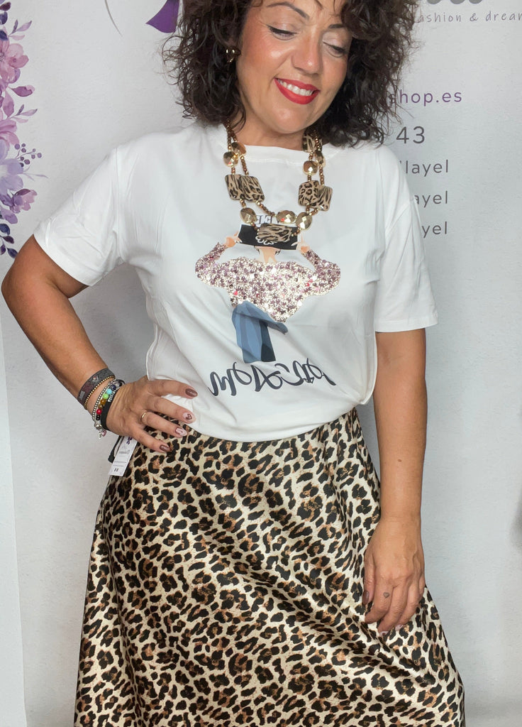 Camiseta dos tallas y dos colores, talla S/M 34/38 y L/XL 38/42, manga corta cuello redondo larga a la cadera y el dibujo lleva lentejuelas en rosa y dorado.