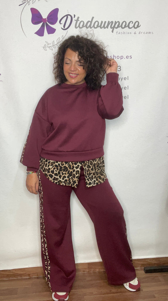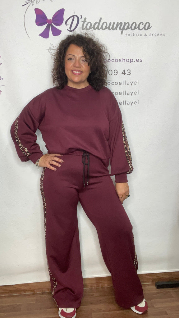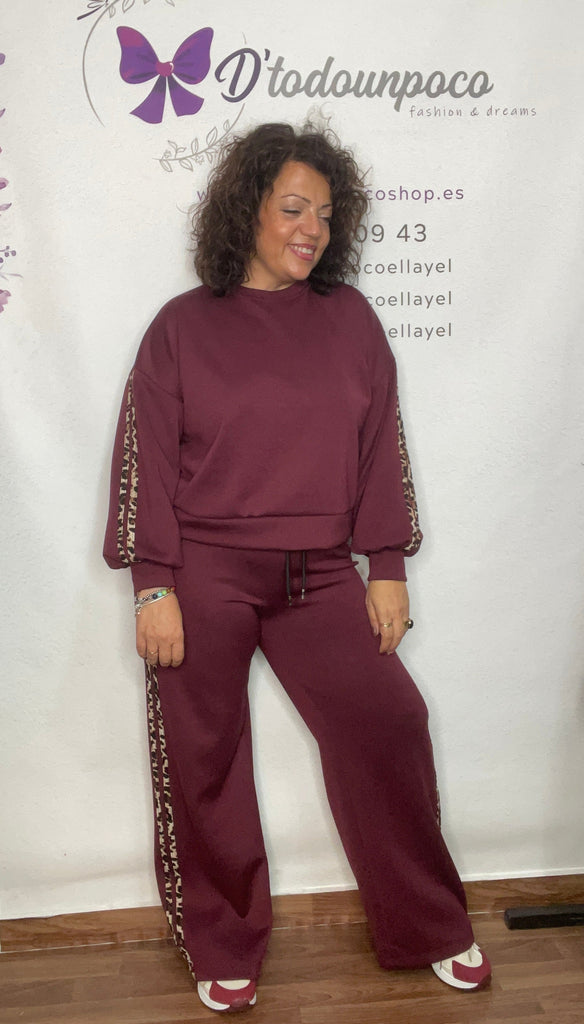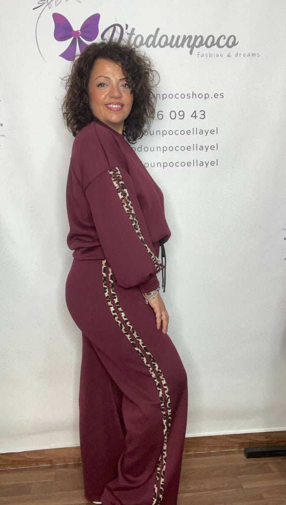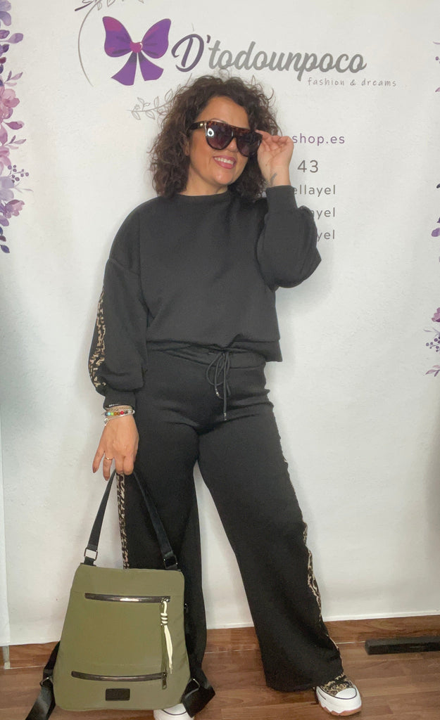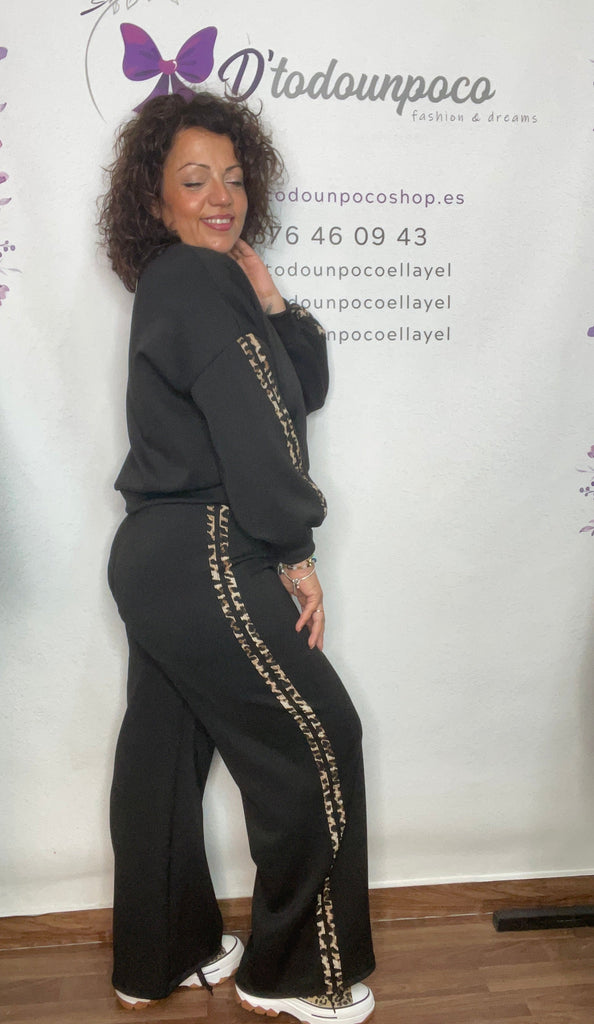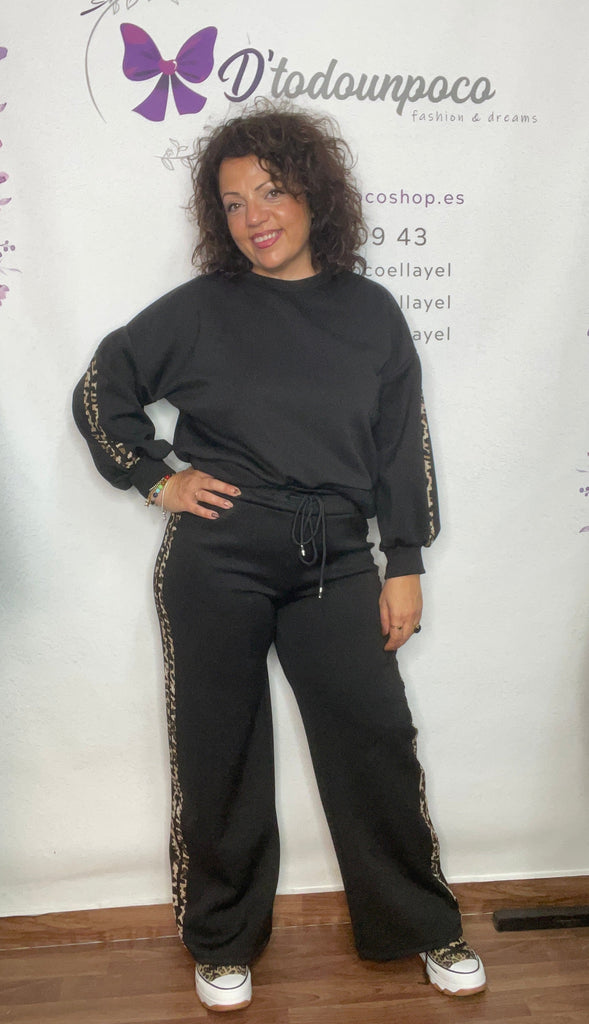 Chándal talla unica de la 36 a la 42. Sudadera corta, manga larga estilo globo, cuello redondo. Pantalón pata ancha, tiro alto y cordón para ajustar cinturilla. detalle dos tiras en animal print en los laterales del pantalón y de las mangas.