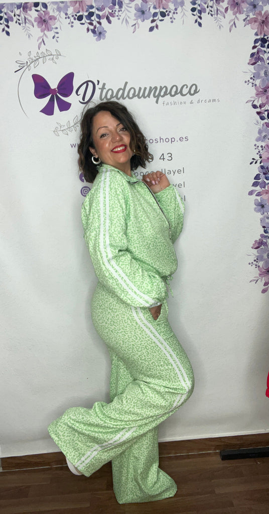 Chándal talla unica de la 34/36 a la 40/42. Chaqueta torera con elástico bajo y en los puños. Pantalón muy largo tiro alto con bolsillos laterales. tejido y estampado chulísimos .