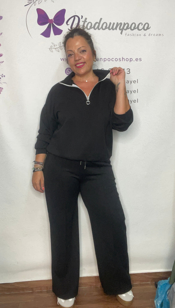 Chándal talla unica de la 36 a la 42/44, MEDIDAS: 60cm sisa, cintura 37cm sin estirar la goma y cadera 54cm, SUDADERA: cuello alto con cremallera, manga larga con puño. PANTALON: pata ancha con bolsillos y cordón para ajustar cintura. TEJIDO: 55%poliester, 39%viscosa y 6%spandex.
