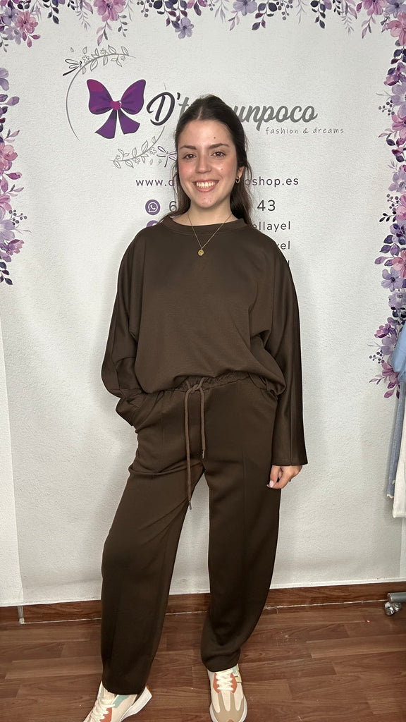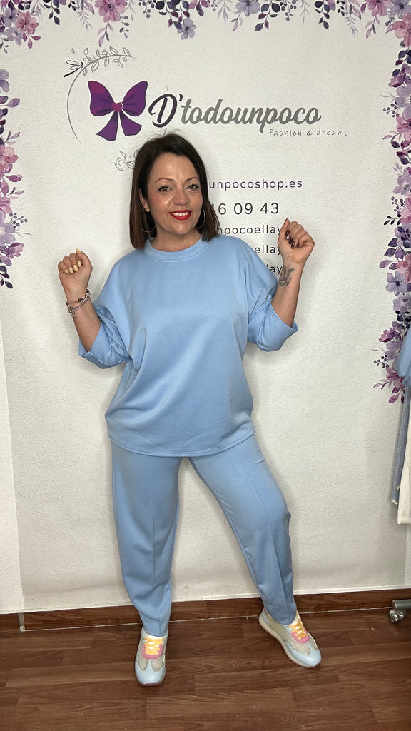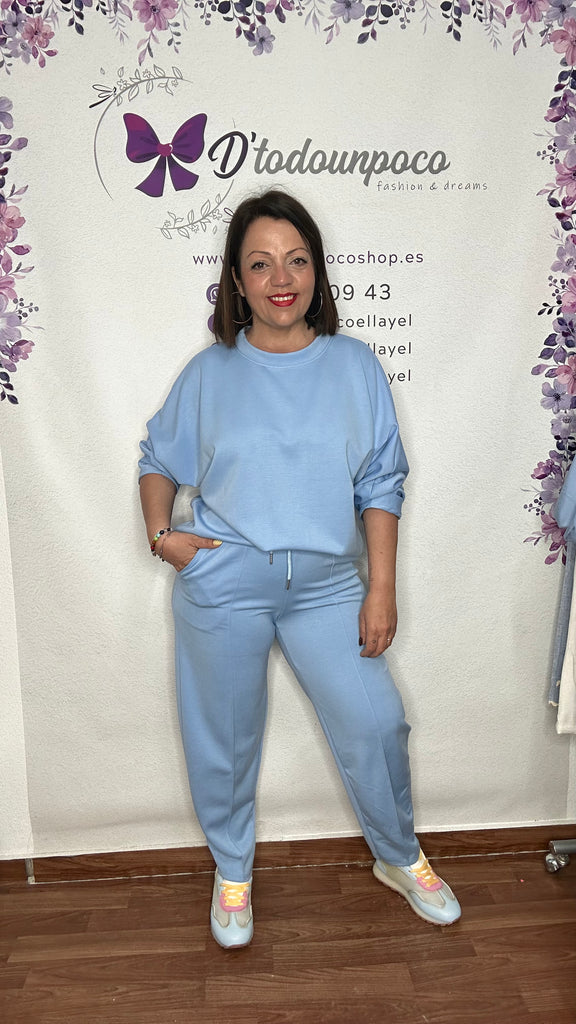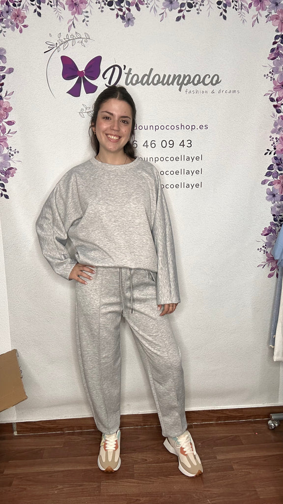 Chándal talla unica de la 36 a la 42. Pantalón corte Baloo tiro alto con cordón y bolsillos. Jersey oversize manga larga cuello redondo y largo.