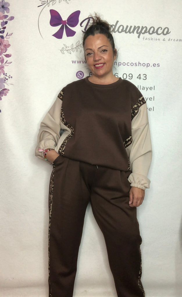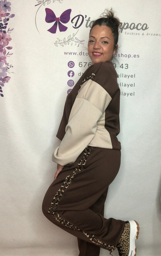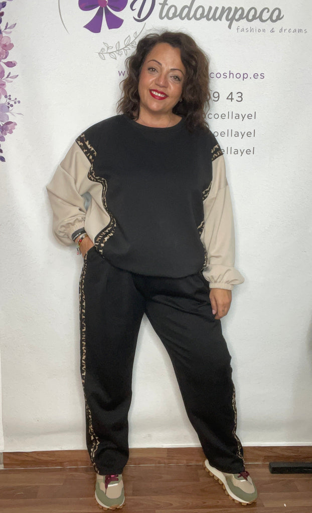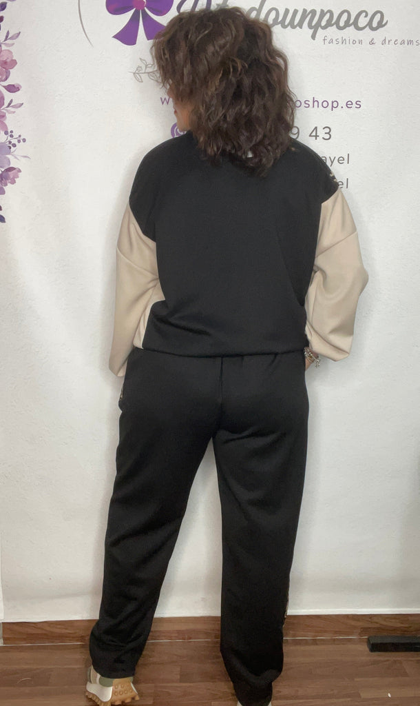 Chándal talla unica de la 40 a la 48, pantalón pata ancha con bolsillos y cordón para ajustar la cintura, sudadera cuello redondo manga larga con puño elástico y lleva también elástico en el bajo de la sudadera.