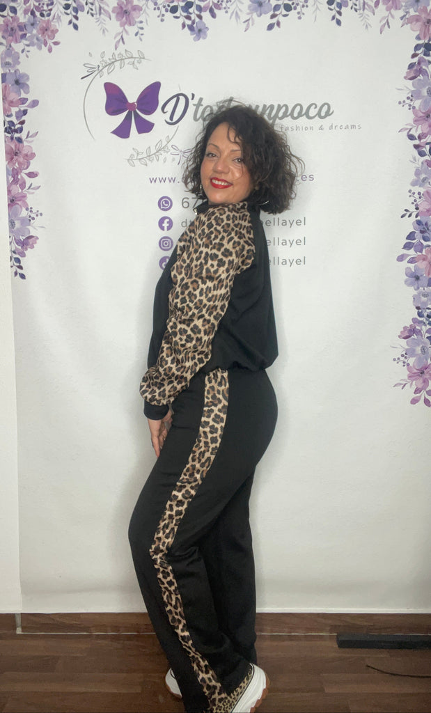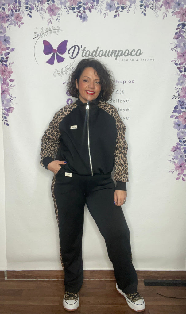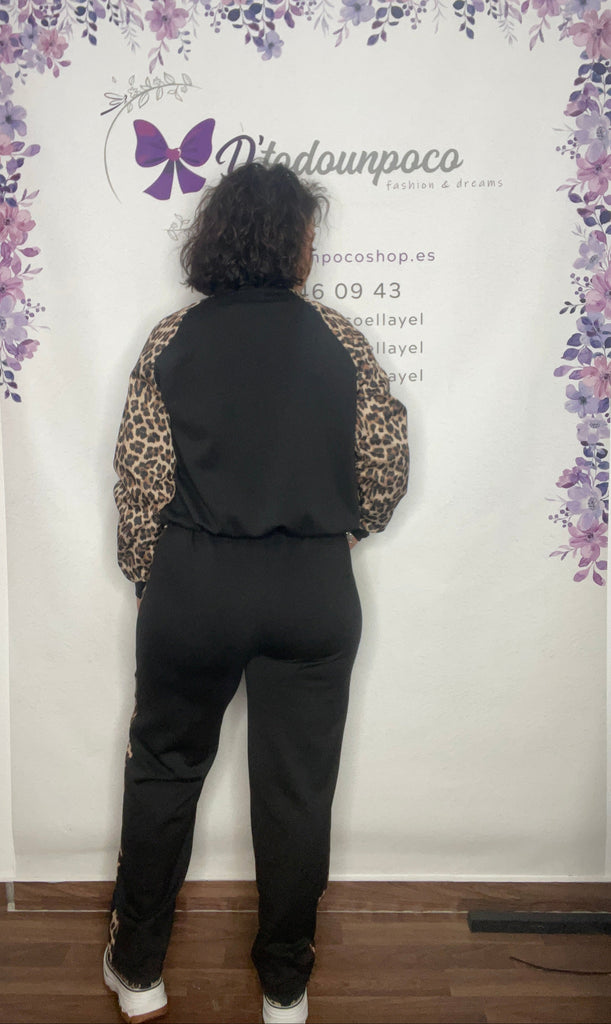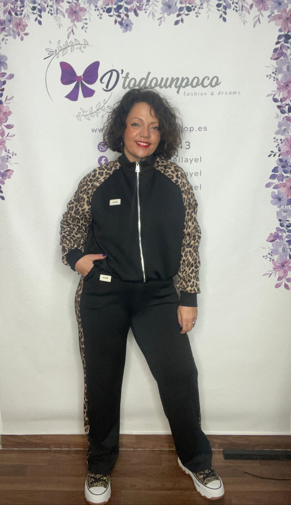 Chándal talla unica de la 36/38 a la 42/44, pantalón tiro alto con cordón para ajustar y bolsillos laterales, es largo y lleva un fanja lateral en animal print. Chaqueta con cremallera elástico en la cintura y las mangas son en animal print.