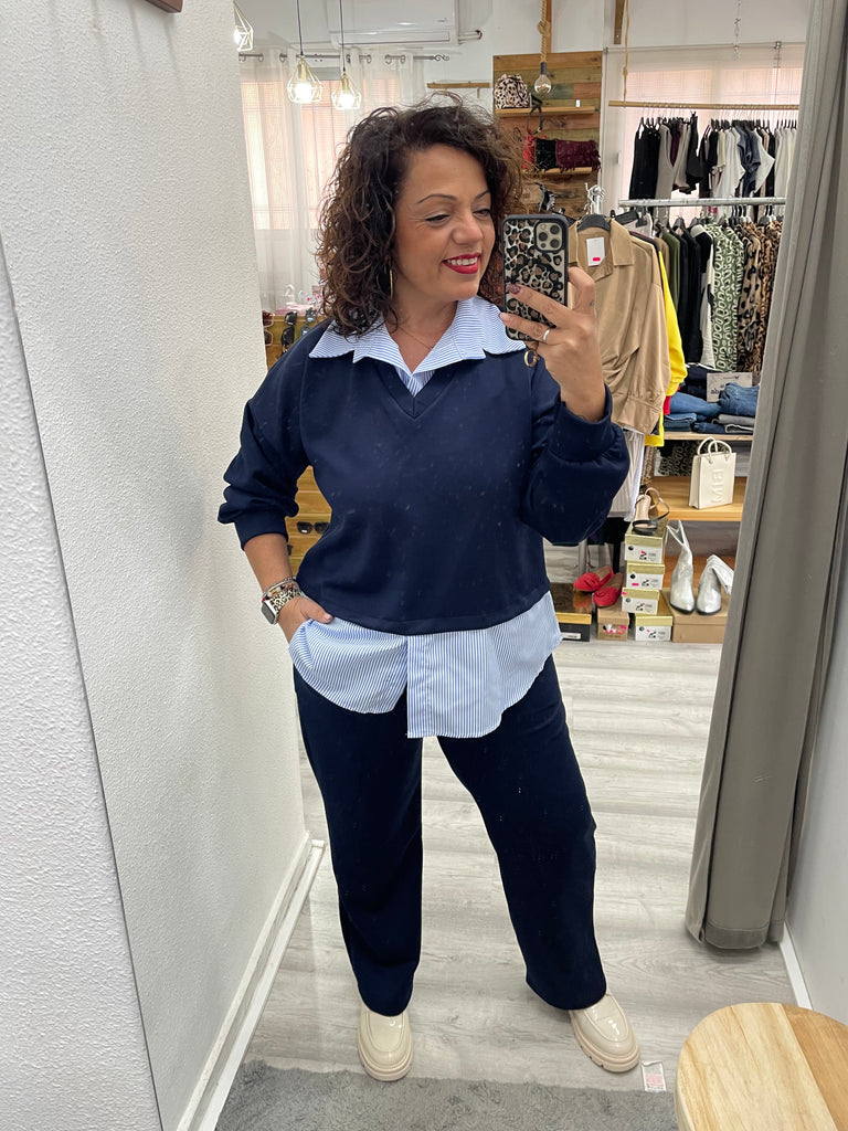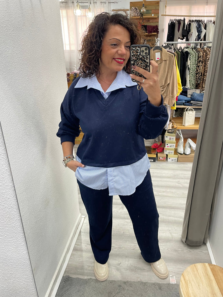 Chándal talla unica de la 36 a la 42, pantalón pitillo con bolsillos laterales y cordón para ajustar la cintura, sudadera manga larga y lleva el cuello y bajo de camisa.