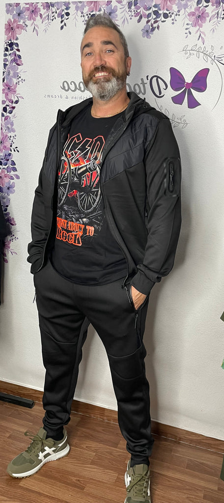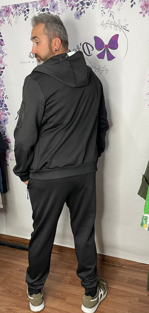 Chándal por tallas desde la S a la 2XL, es un poco calentito por dentro, el chico de la foto lleva en gris la talla L y en negro la talla M. PANTALON pitillo con puño y bolsillos laterales con cremallera y detrás lleva el típico cuadrado. CHAQUETA: capucha, con cuello subido bolsillos laterales con cremallera en el brazo lleva una cremallera que es de adorno.