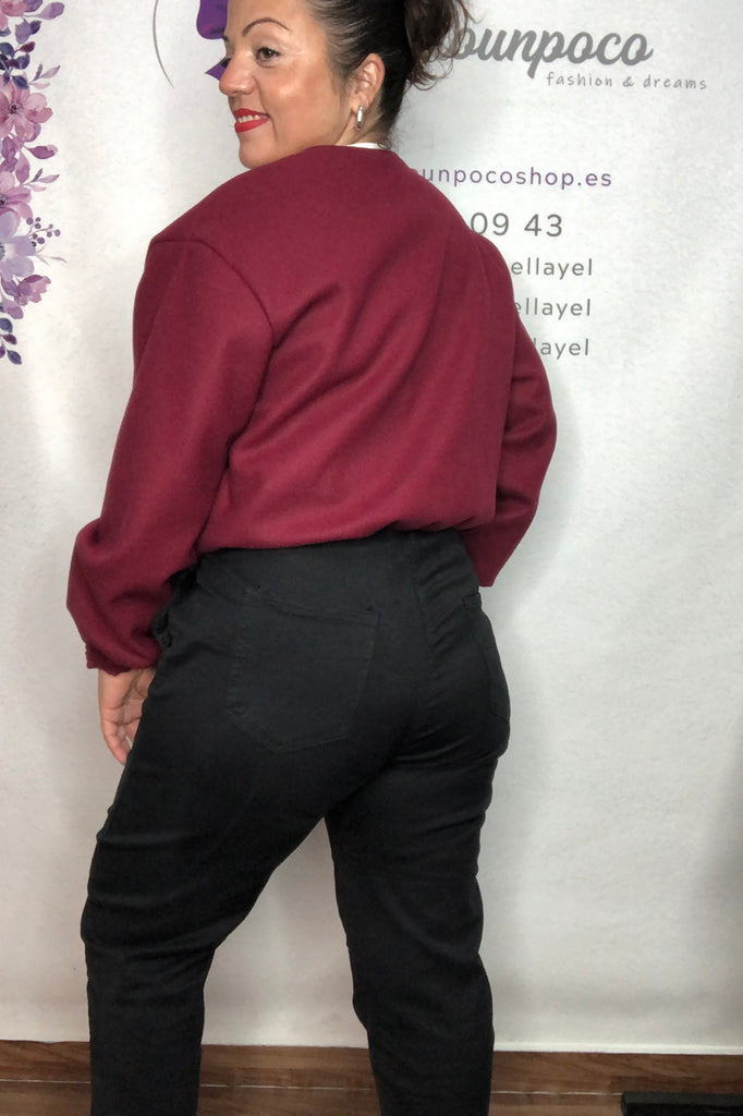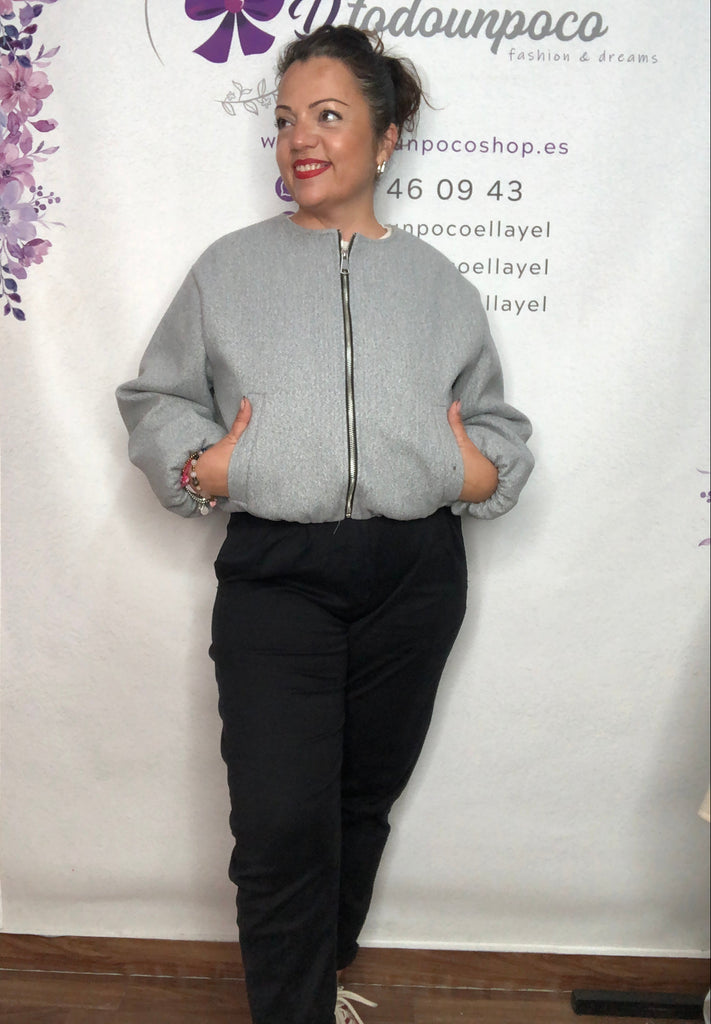 Chaqueta de paño con forro, talla unica de la 36 a la 42, cuello redondo, cremallera, bolsillos laterales y manga larga con puño elástico.