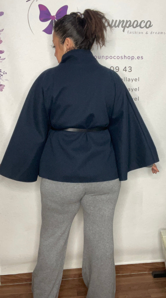 Chaqueta estilo capa, talla unica de la 36 la 44, cuello alto con botón y cinturon.