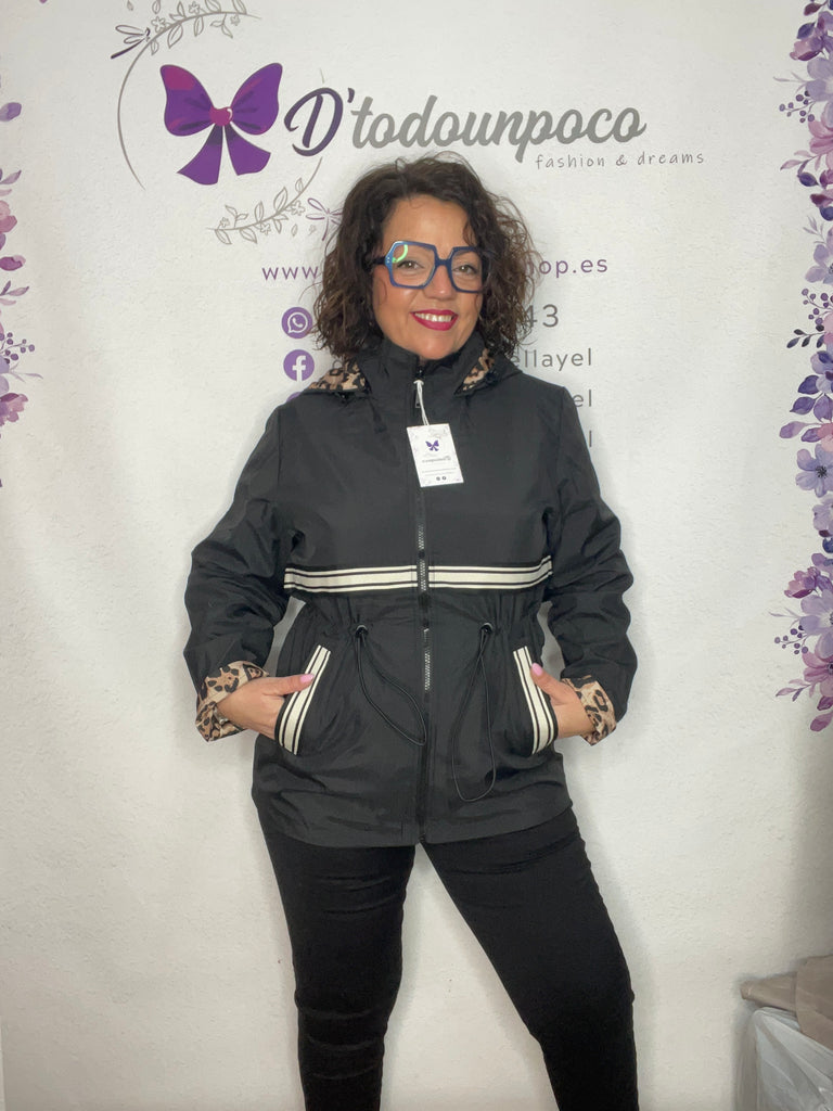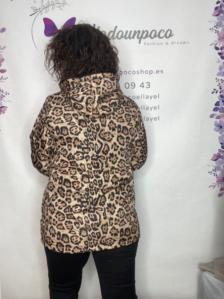 Chaqueta tipo anorak, manga larga bolsillos laterales y capucha que se puede quitar, reversible animal print. lleva tallas de la S a la XXL y yo llevo la talla M