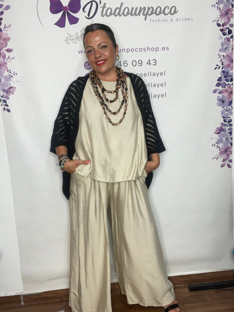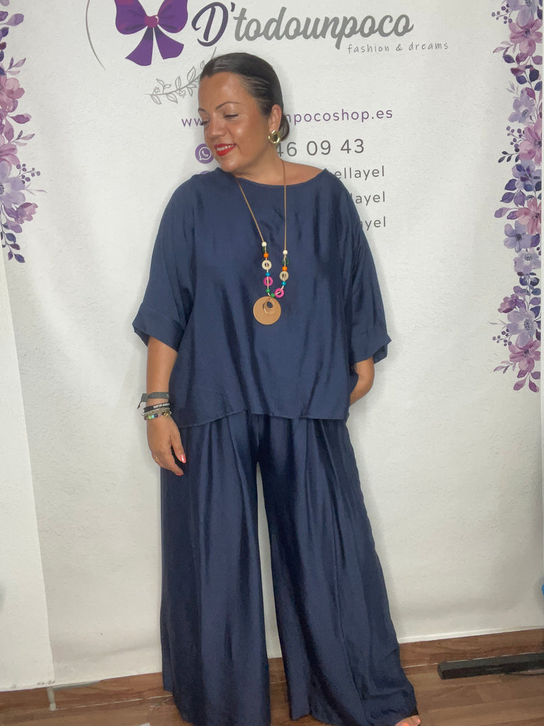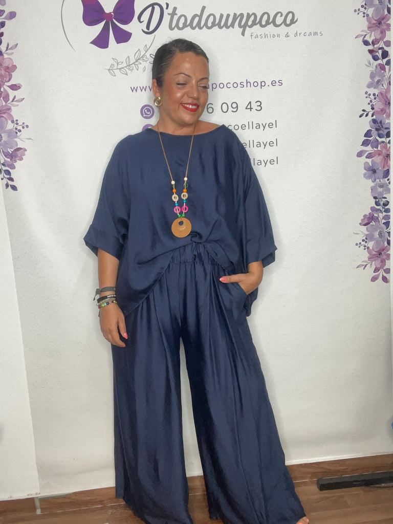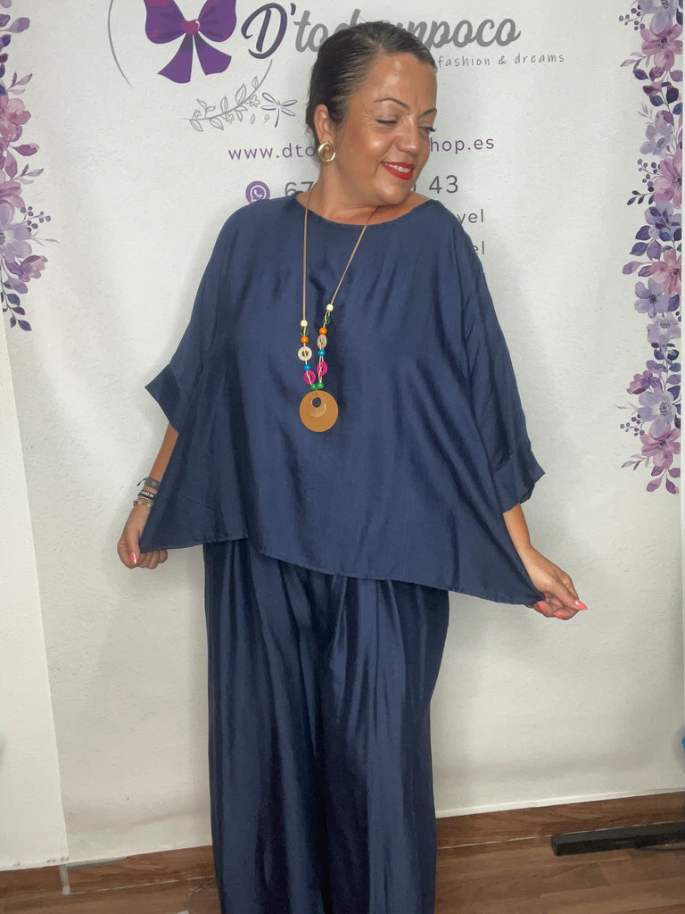Conjunto talla unica de la 38/40 a la 46/48, pantalón pata ancha con bolsillos y elástico en la cintura, blusón corte murciélago manga corta, cuello redondo y collar incluido.
