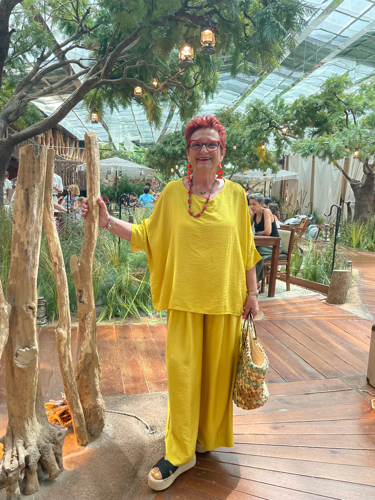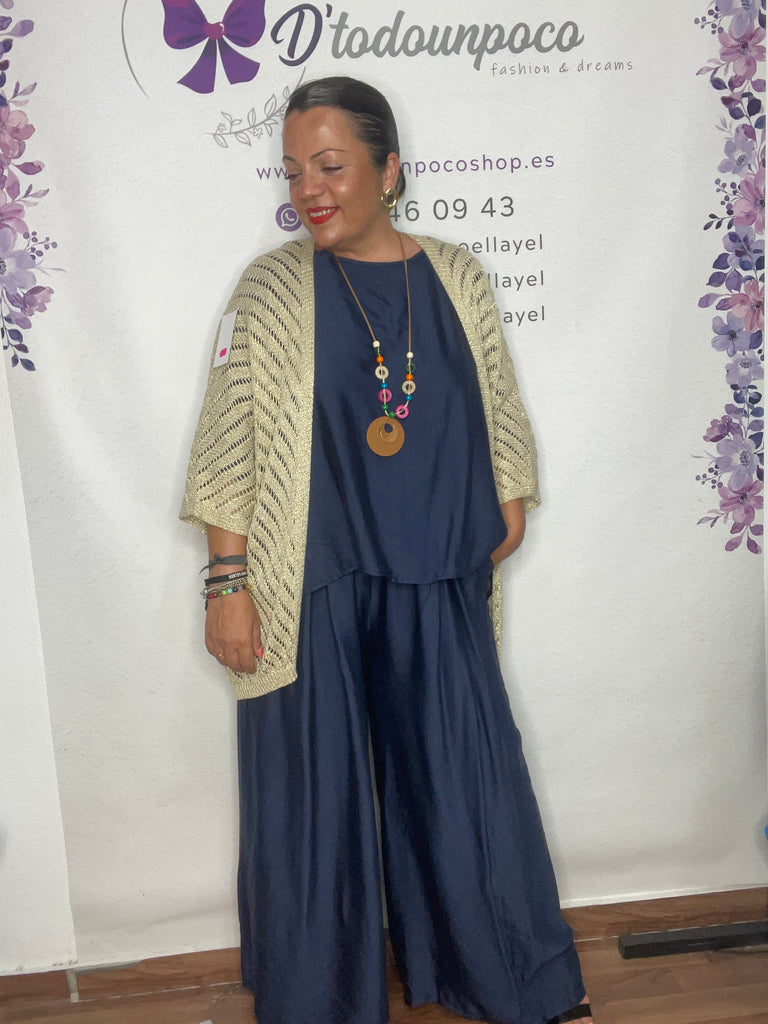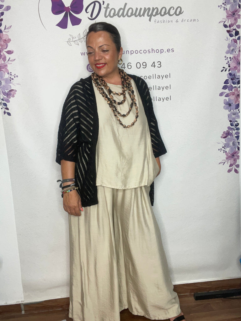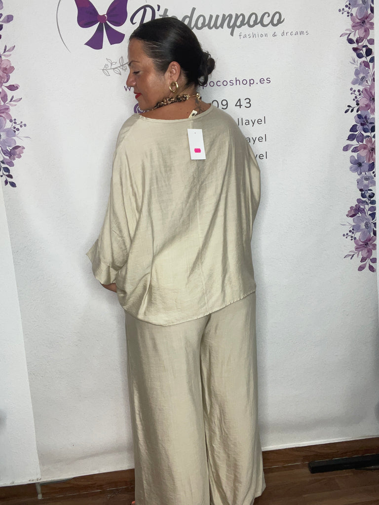Conjunto talla unica de la 38/40 a la 46/48, pantalón pata ancha con bolsillos y elástico en la cintura, blusón corte murciélago manga corta, cuello redondo y collar incluido.