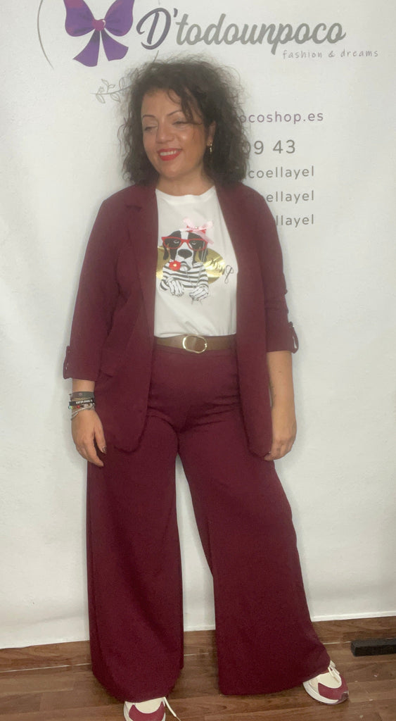 Conjunto talla unica de la 36/38 a la 42/44. Blazer media manga con botón, cuello esmoquin y solapas laterales no lleva forro. Pantalón tiro alto con cinturón incluido bolsillos laterales y pata muy ancha bajo.
