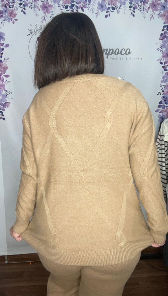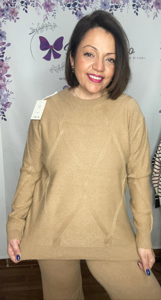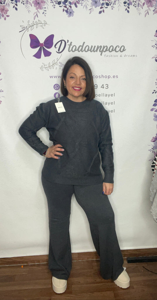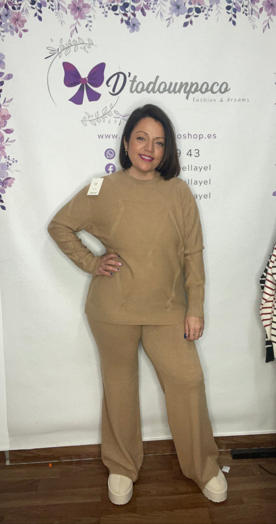Conjunto dos tallas S/M 36/42 y L/XL 42/46. Pantalón tiro alto y pata ancha. Jersey cuello redondo manga larga y largo a la cadera, lleva un diseño en rombo por delante por detrás y en las mangas.