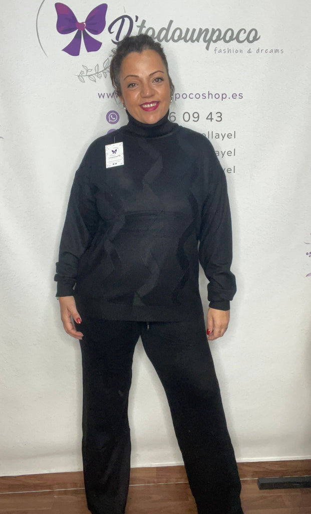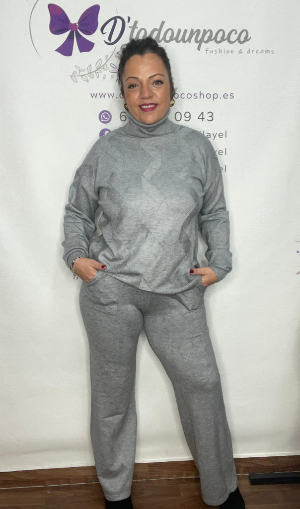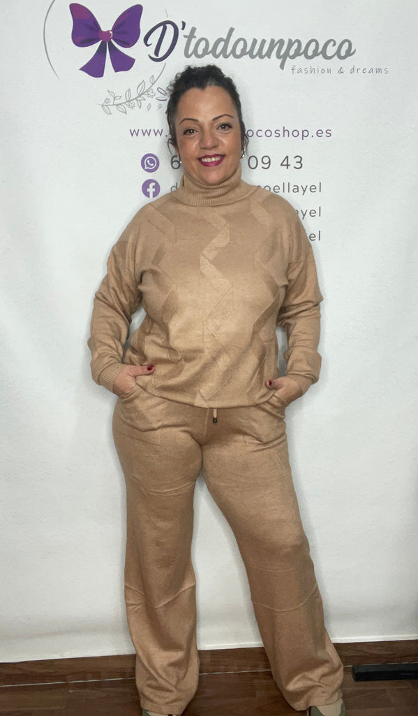 Conjunto punto talla unica de la 36 a la 42/44. Pantalón pata ancha tiro alto con cordón para ajustar cintura y bolsillos. Jersey manga larga cuello vuelto y largo por la cadera.