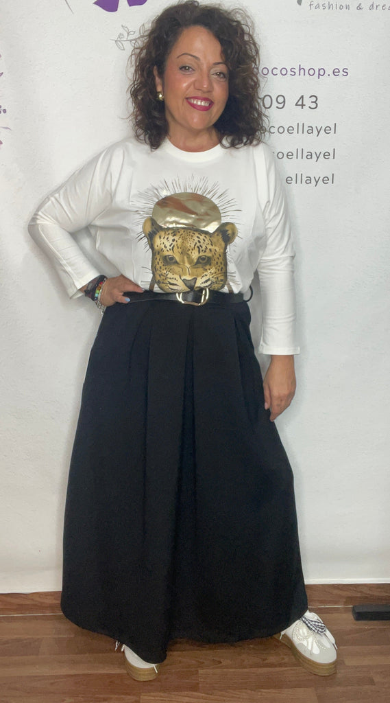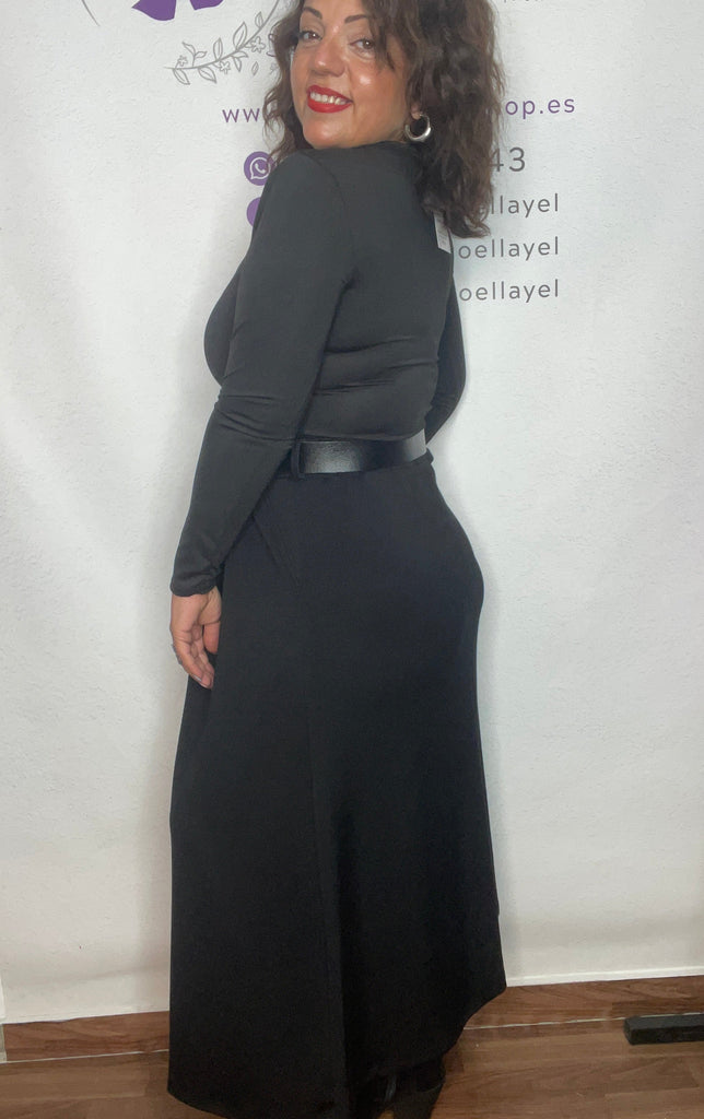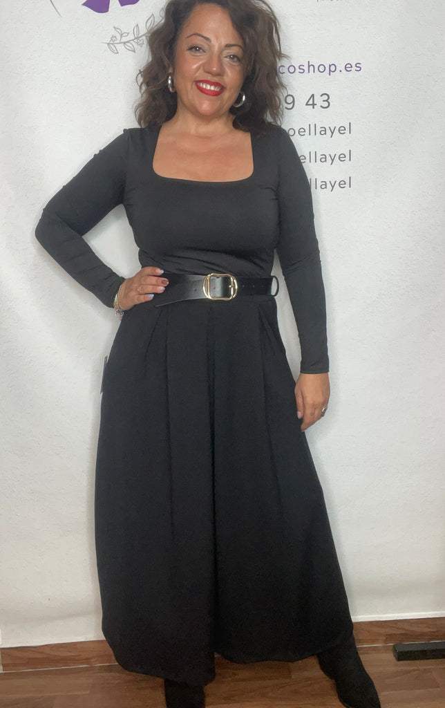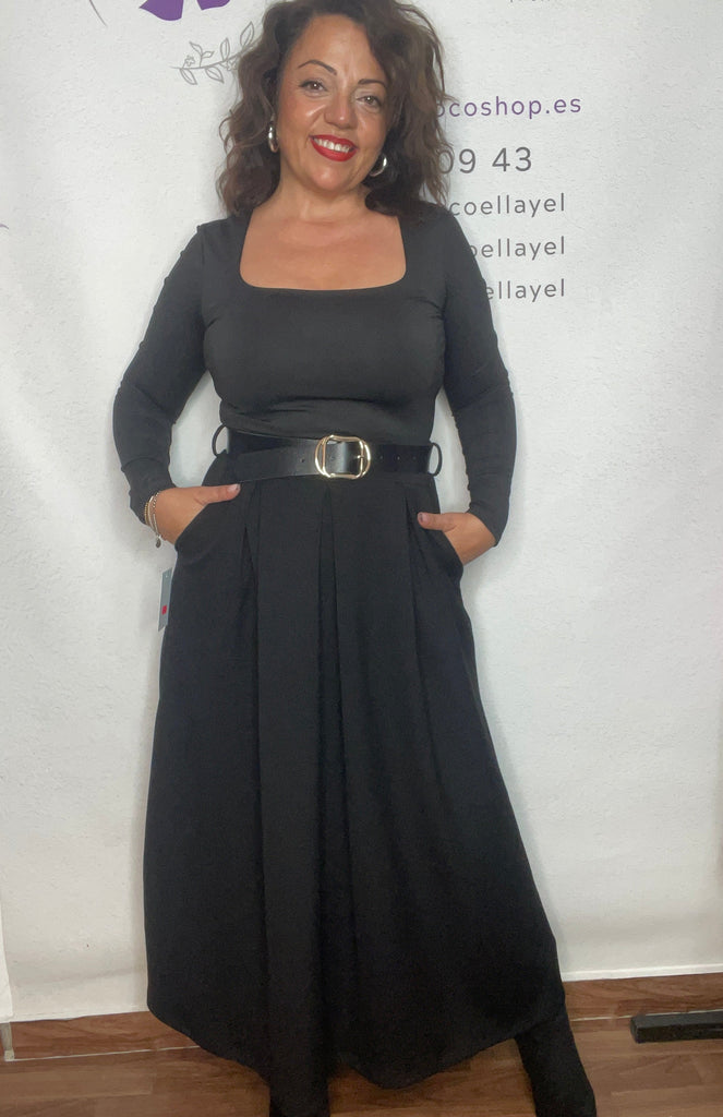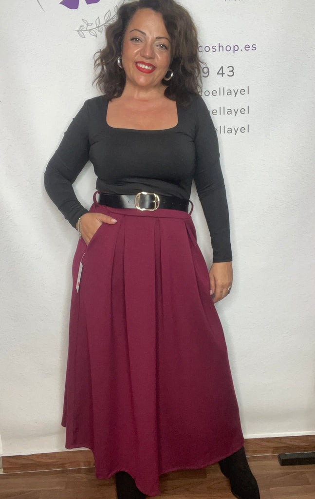 Falda talla unica de la 36/38 a la 42/44, cinturón incluido, bolsillos laterales, larga por el tobillo y corte evase y en tablas.