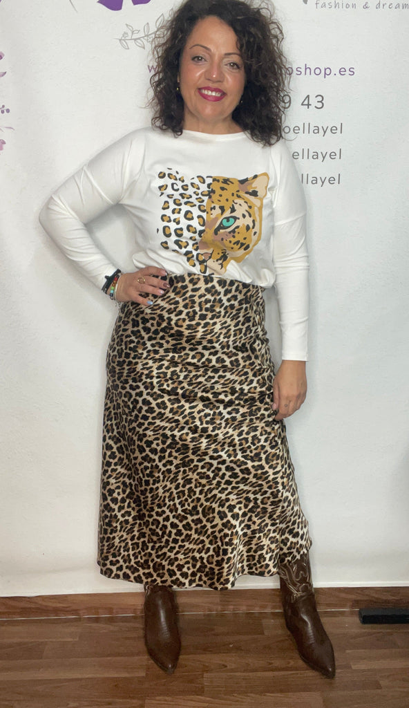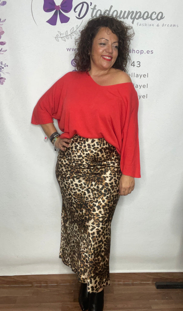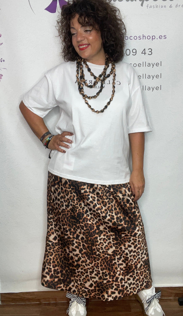 Falda dos modelos. talla pequeña de la 36/38 a la 42 y talla grande de la 44 a la 48/50, elástico en la cintura tejido raso estampado animal print largo midi.