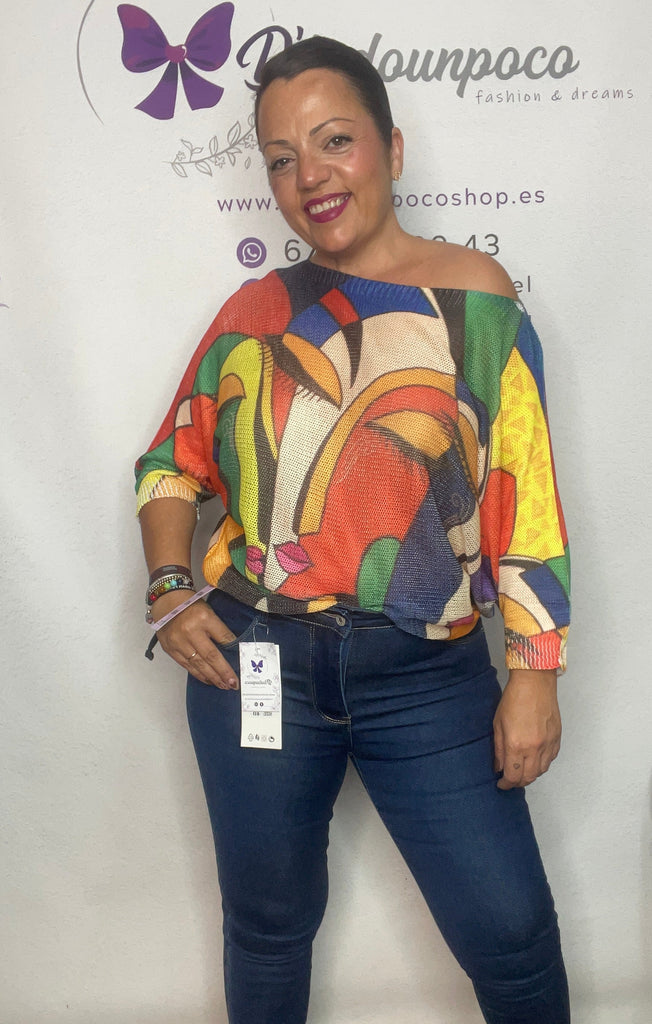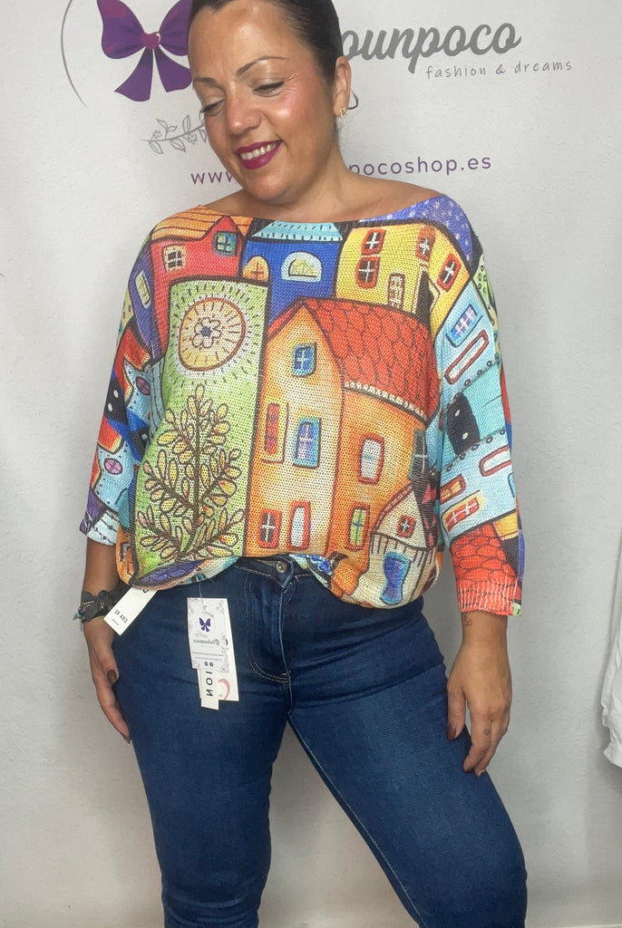 Jersey talla unica de la 36 a la 44/46, manga al codo, cuello ovalado, corte murciélago y largo a la cadera, tejido punto gordo.