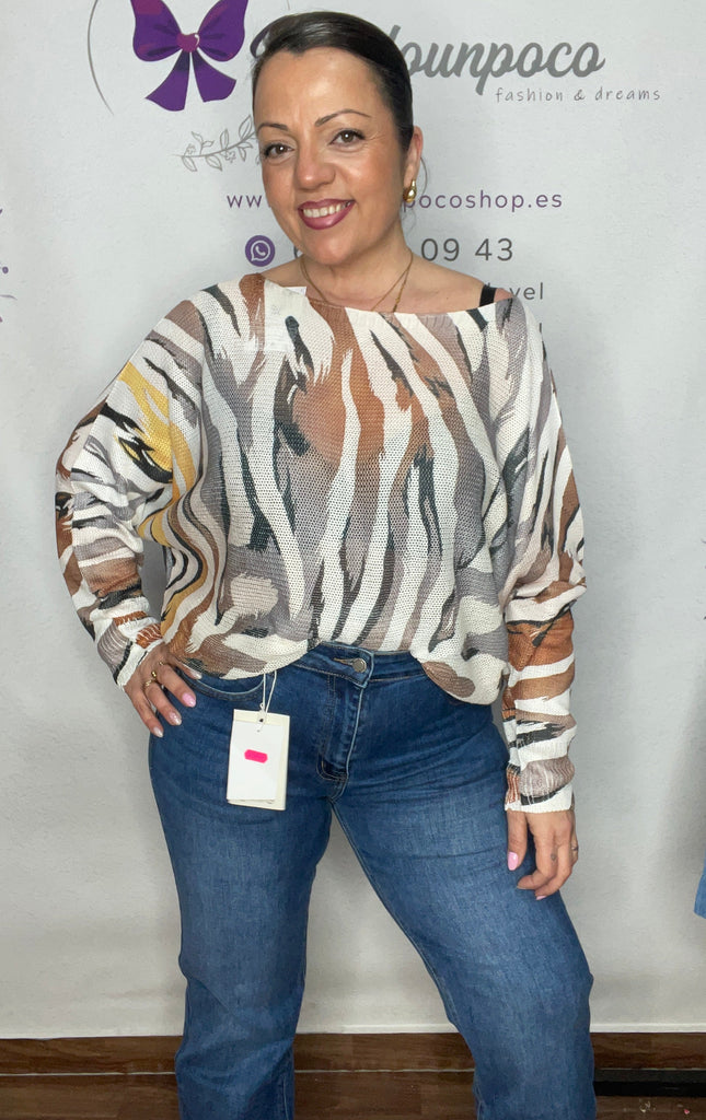 Jersey talla unica de la 36/38 a la 48, calado, cuello ovalado manga larga y cote murciélago.