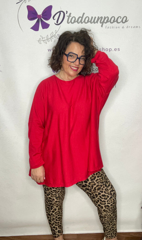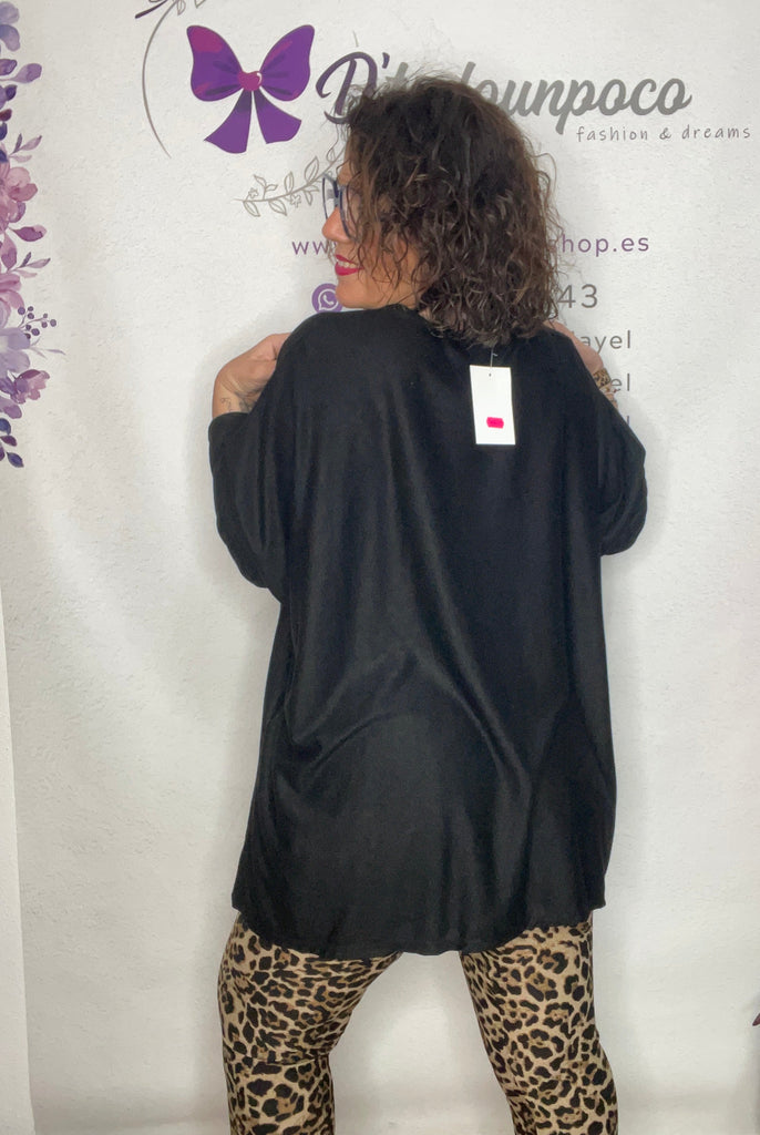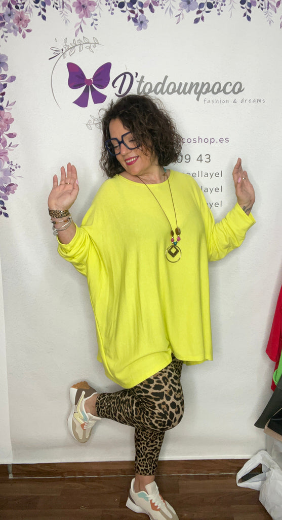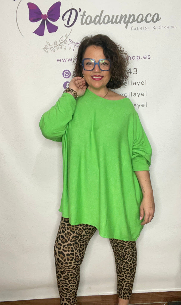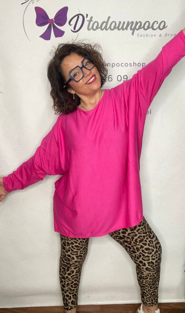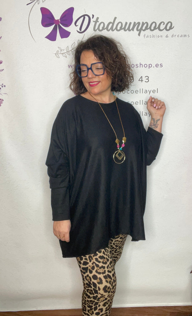 Jersey talla unica de la 38/40 a la 50, manga larga cuello redondo y es corte murciélago, larga tejido punto fino y lleváis el collar incluido