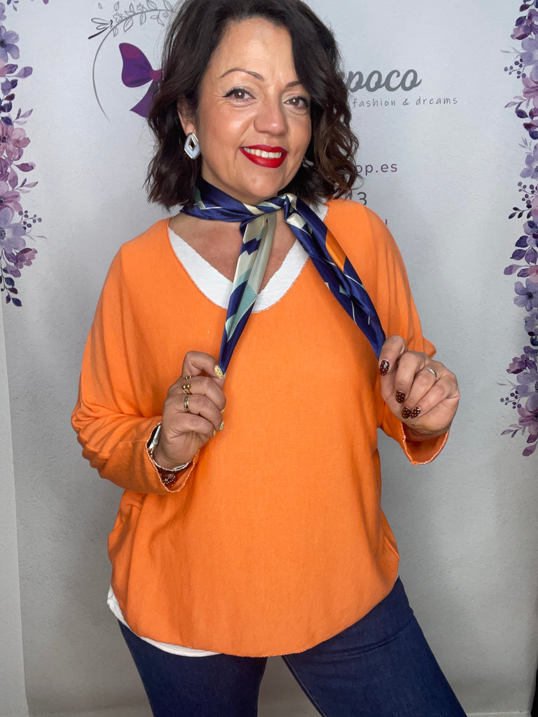 Jersey talla unica de la 38 a la 44/46, lleva camiseta blanca tirante ancho y larga , jersey de punto manga larga cuello de pico y larga a la cadera y collar incluido.