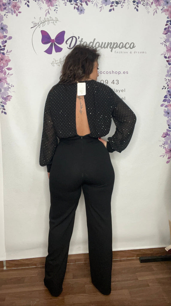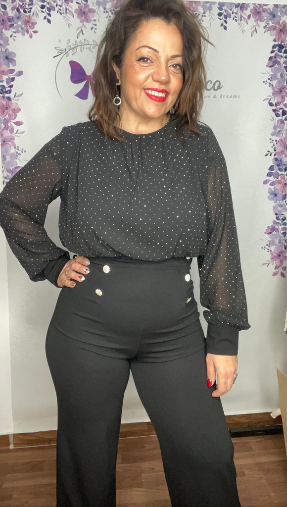 Mono talla unica de la 36 a la 40, blusa gasa con piedras de brilli, y espalda con botón en el cuello pantalón es tiro muy alto con botones delanteros marineros y pata ancha.