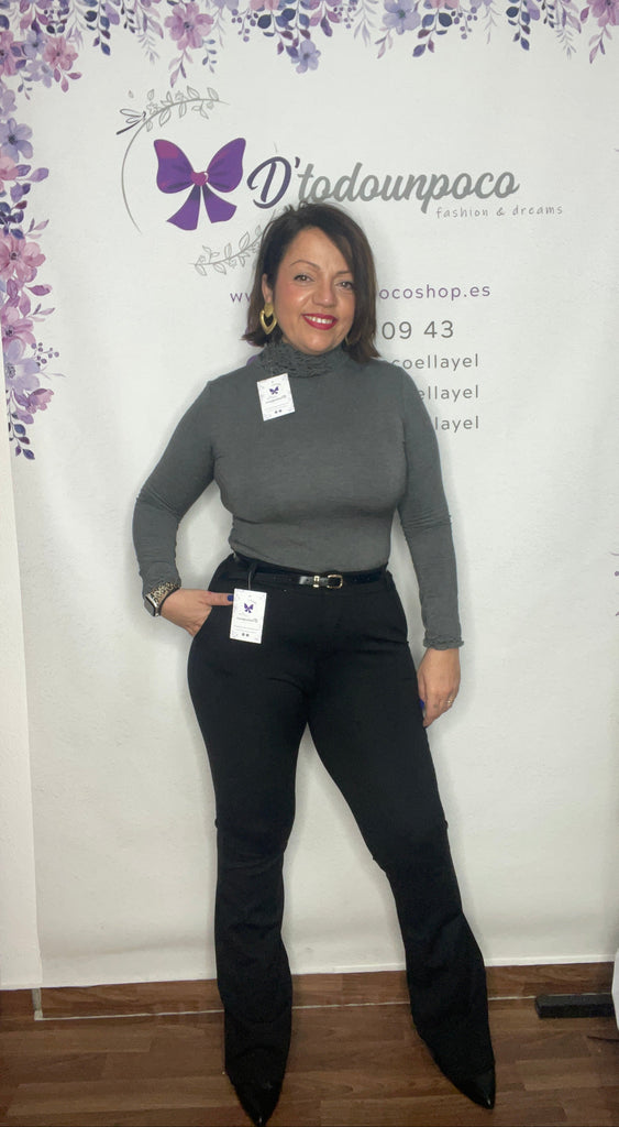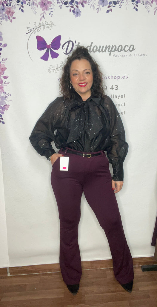 Pantalón por tallas S, M y L yo llevo la M, tiro alto campana bolsillos laterales y cinturón fino incluido.