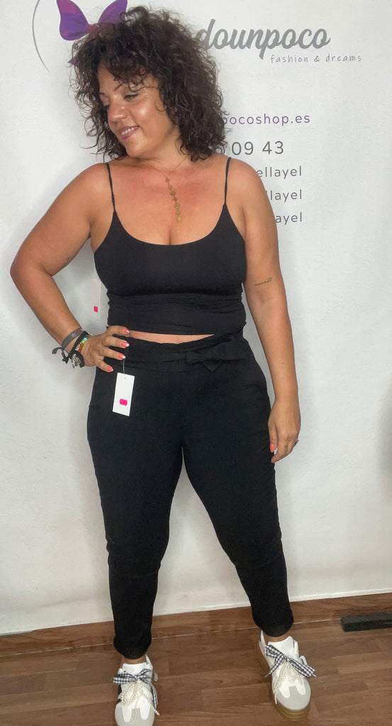 Pantalón pitillo, tiro alto bolsillos laterales y elástico en la cintura, dos tallas la pequeña da talla desde la 36 a la 42 y la talla grande de la 42/44 a la 48/50, lleva un cinturón del mismo tejido. es de licra