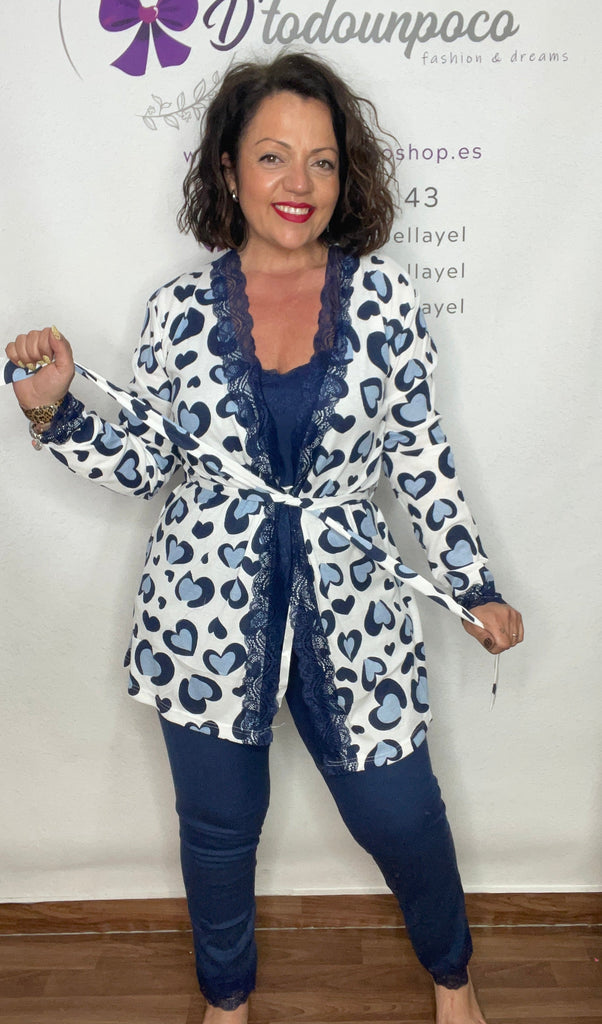 Pijama tres piezas y por tallas M,L,XL,XXL y XXXL, YO LLEVO LA L. Bata manga larga y larga por el muslo, encaje y lleva lazada interior y cordón exterior, camiseta tirantes con encaje en el escote y larga color liso, pantalón con encaje bajo y elástico en la cintura.