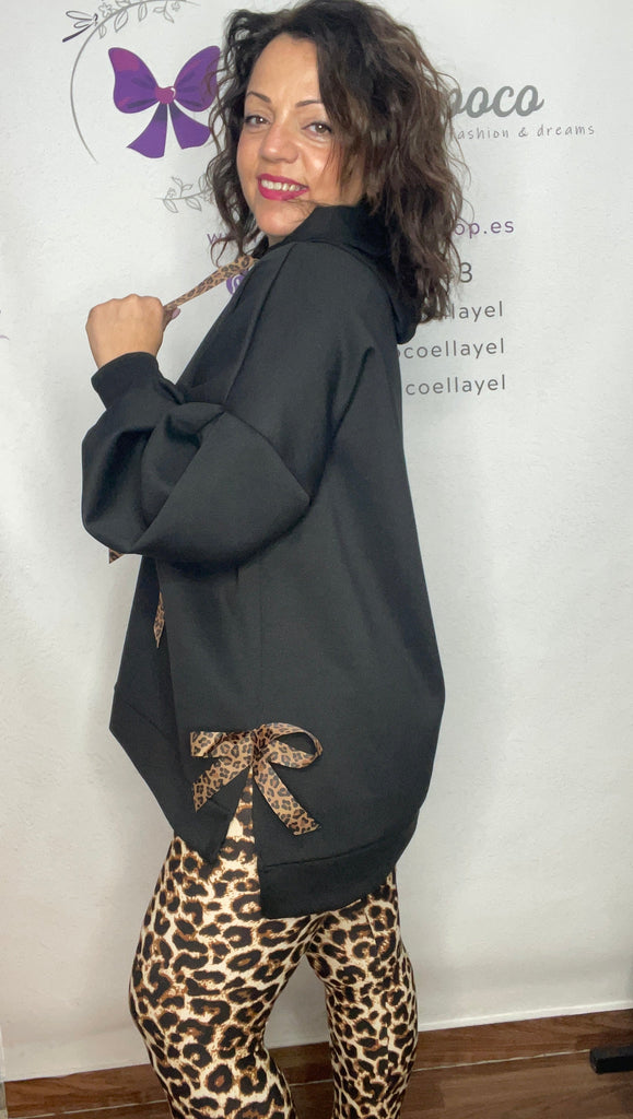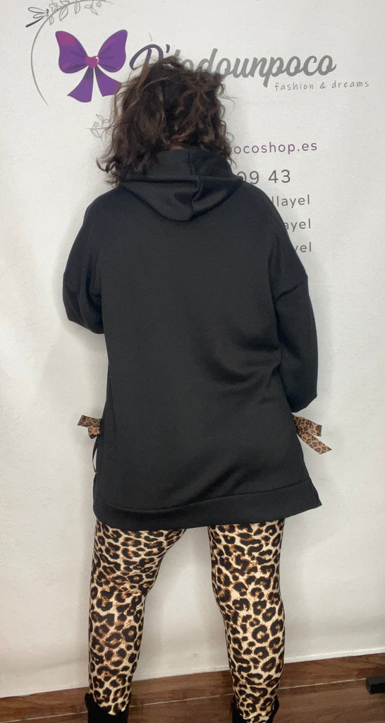 Sudadera talla unica de la 36/38 a la 44/46, manga larga, capucha, larga por detrás con dos pequeñas aberturas en los laterales con dos lacitos en animal print a juego con los cordones de la capucha.