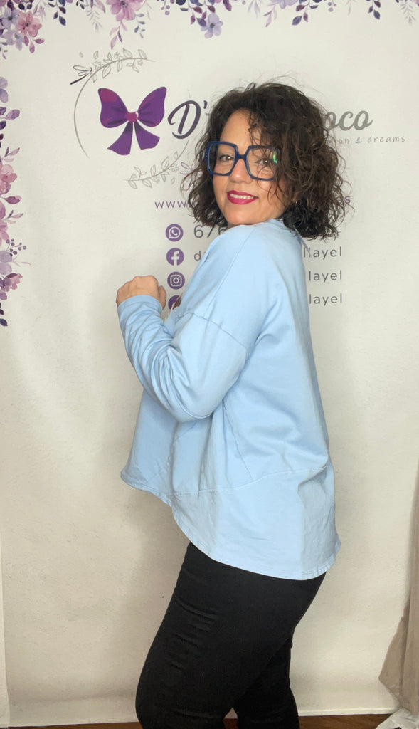 sudadera talla unica de la 36 a la 46, manga larga cuello redondo y es mas larga por detrás , fina sin afelpar.