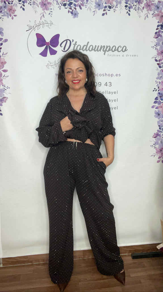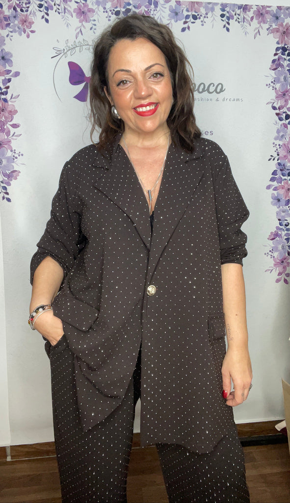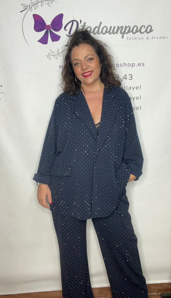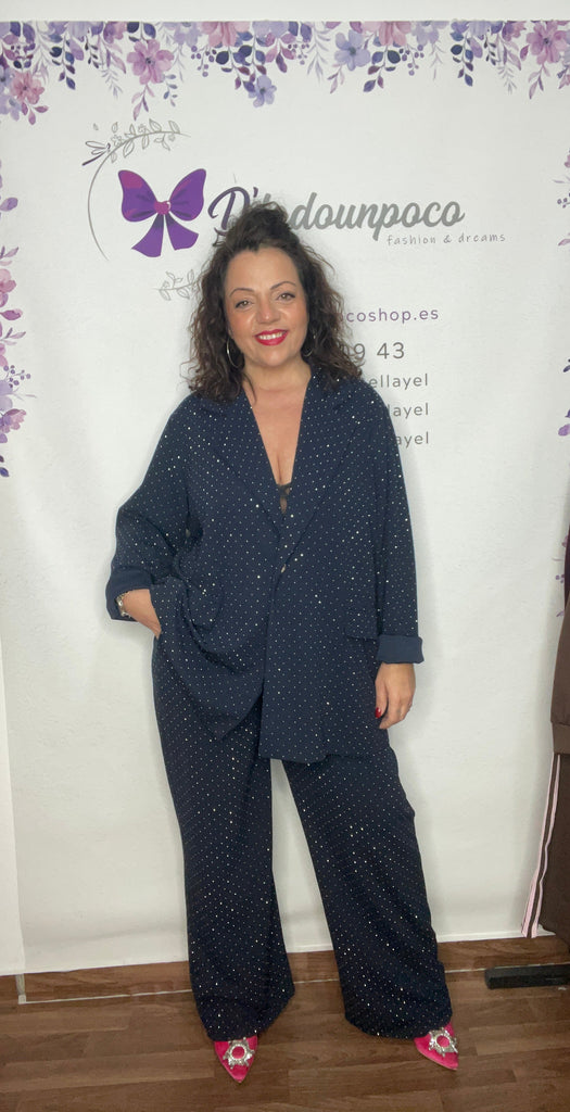 Traje talla unica de la 44 a la 52, pantalón recto elástico en la cintura y bolsillos, chaqueta sin forro manga larga cuello esmoquin y larga abrocha con un botón.
