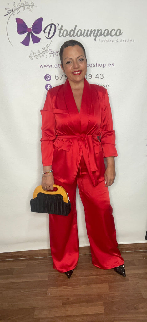 Conjunto talla unica de la 36 a la 42/44, tejido Raso dos piezas. Pantalón tiro alto, bolsillos laterales elástico en la cintura y pata ancha. Chaqueta anudada con cinturón, hombreras, manga larga, cuello esmoquin y solapas bolsillos.