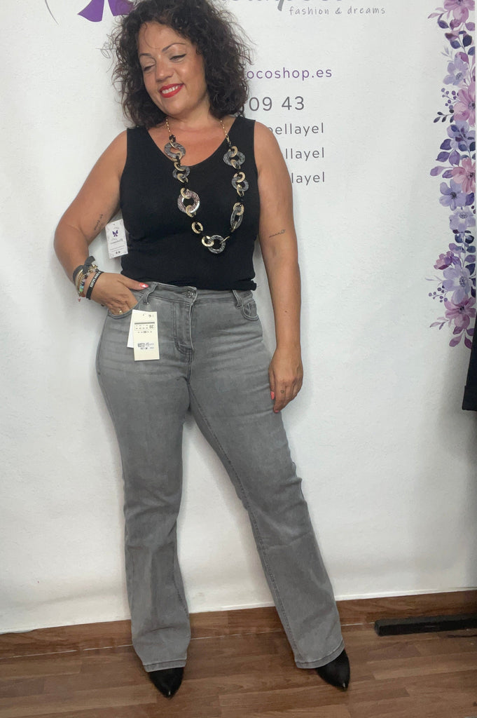 Vaquero por tallas de la 34 a la 42, yo llevo la 38. Tiro alto pata ancha y largo comodísimos y son inspiración.