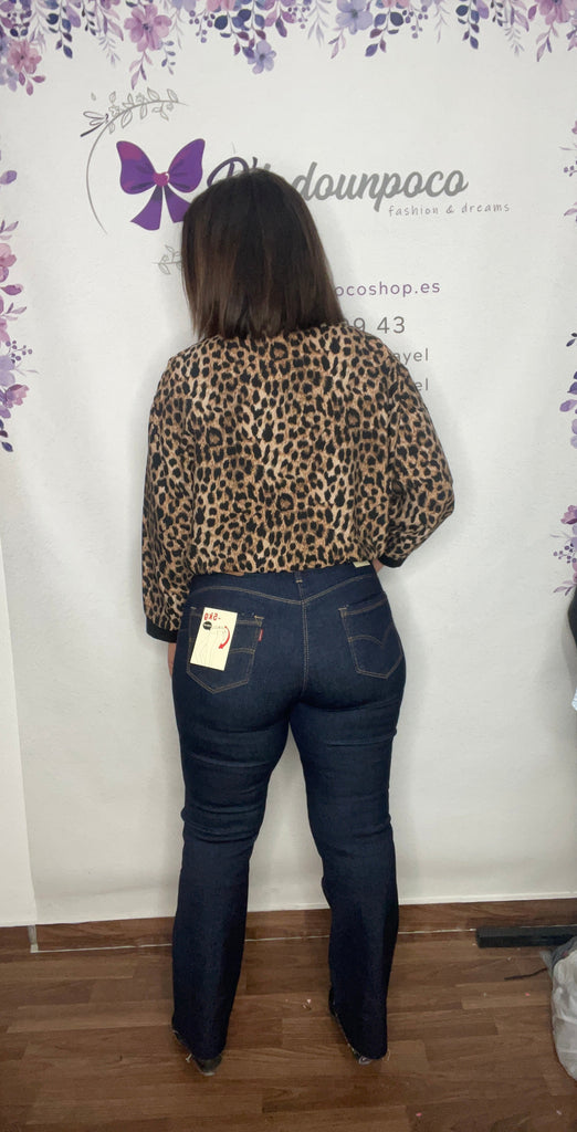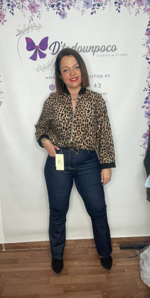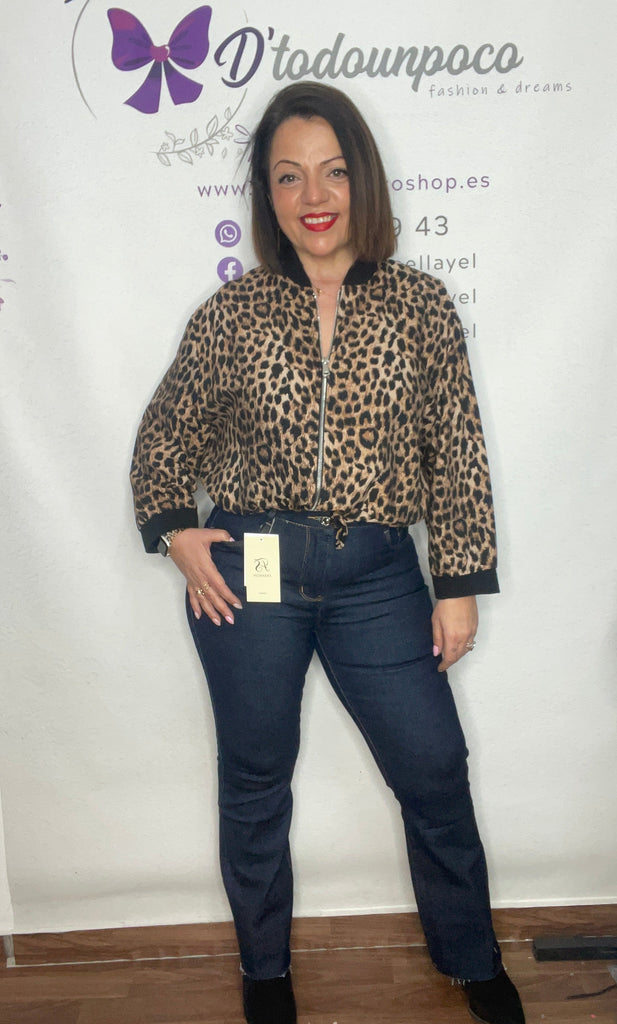 Vaquero por tallas de la 34 a la 42, yo llevo la 38, elástico tiro alto , campana y desflecado, inspiración tanto el vaquero como el color.