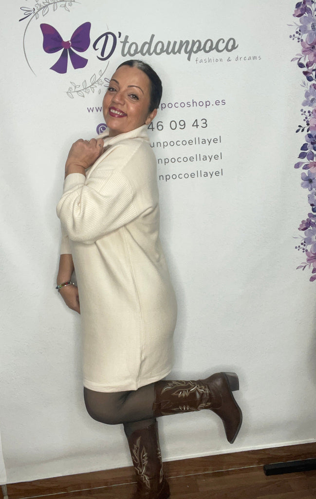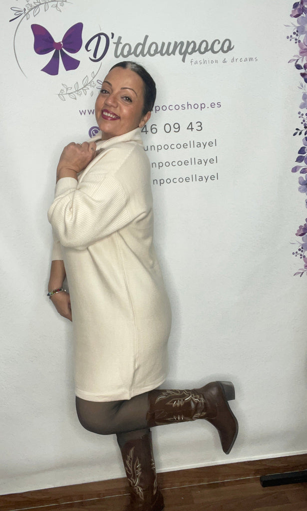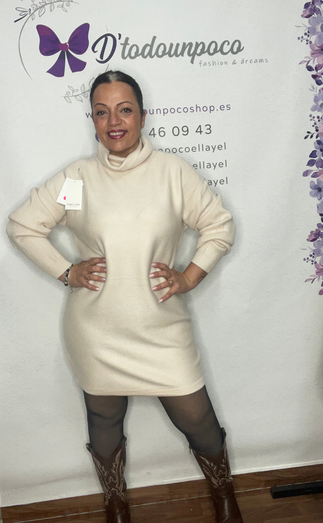 Vestido Punto gordito pesa de la calidad que tiene y dos tallas M/L Y XL /XXL, manga larga cuello vuelto y es corto por encina de la rodilla.