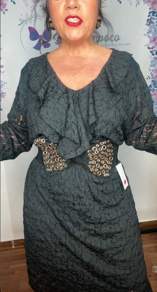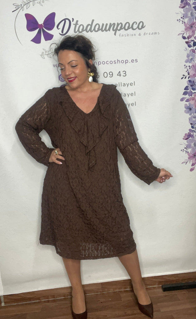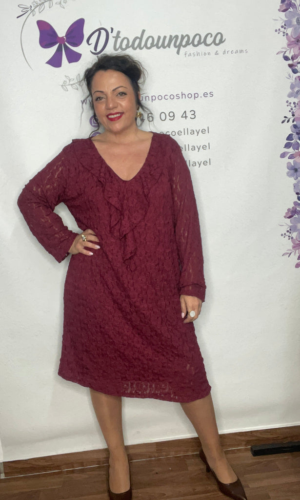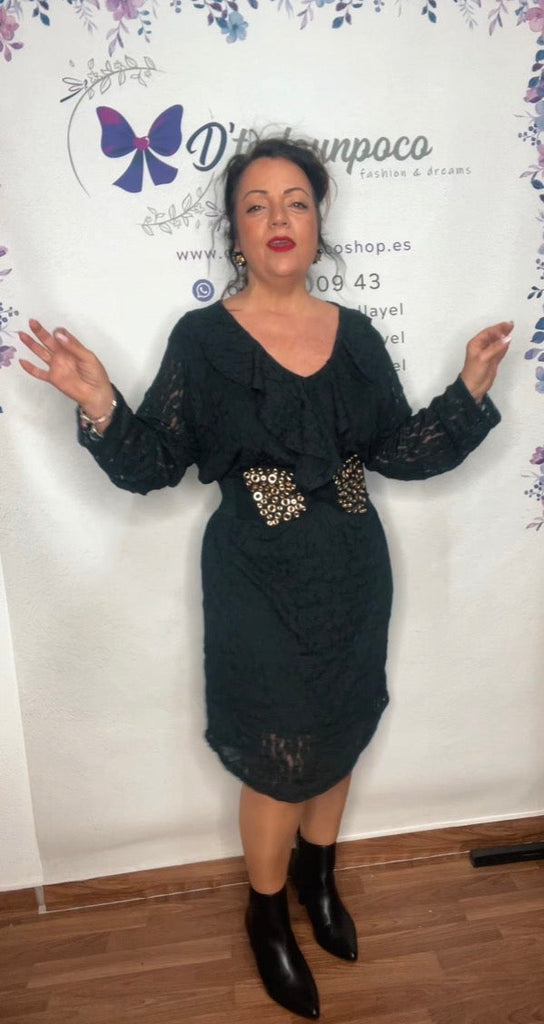 Vestido talla unica de la 44 a la 48/50, manga larga con trasparencias escote en V con un volante divino, largo por la rodilla y lleva forro interior por la parte del cuerpo.