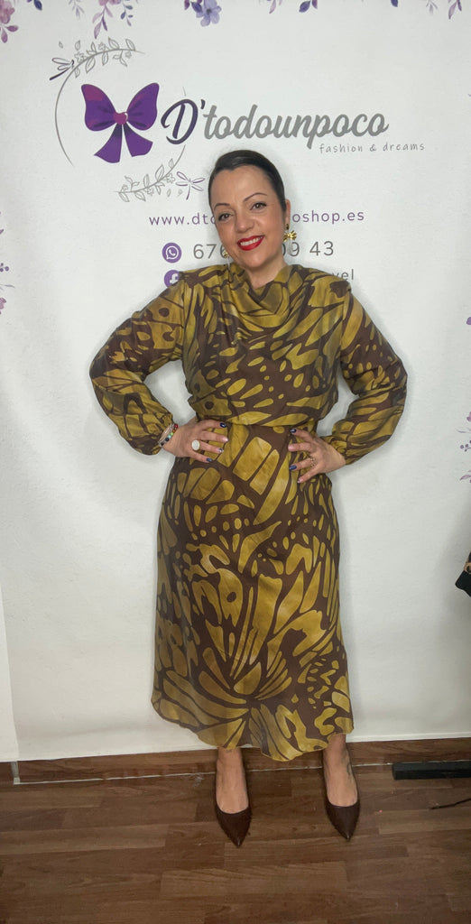 Vestido talla unica de la 36 a la 40/42, manga larga con elástico en el puño, abotonado por detrás , en la cintura lleva elástico, y es corte mide y lleva forro interior.